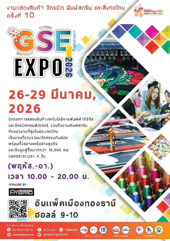 2. งานแสดงสินค้าเทคโนโลยี จักรปัก พิมพ์สกรีน และสิ่งทอไทย ครั้งที่ 10 ( The 10th Garment Screen & Embroidery 2026 ) เป็นการรวมตัวของผู้ประกอบการไทย กลุ่มเครื่องจักร ที่ใช้ในอุตสาหกรรมเสื้อผ้าสิ่งทอ อาทิเช่น เครื่องพิมพ์บนผ้า กลุ่มจักรปัก กลุ่มจักรเย็บผ้า กลุ่มจักรเย็บเครื่องหนัง กลุ่มงาน ทรานเฟอร์ และวัสดุ อุปกรณ์ที่ใช้ในวงการอุตสาหกรรมงานผ้าและสิ่งทอมารวมตัวกัน อีกทั้ง ผู้ประกอบการด้านธุรกิจเสื้อผ้า สิ่งทอ จากองค์กรต่างๆที่เข้าร่วมงานในครั้งนี้ เพื่อนามาประยุกต์ และปรับใช้ในการทางานของแต่ละองค์กร เพื่อเป็นการลดต้นทุน และค่าใช้จ่ายในการผลิตบริหารภายในองค์กร พร้อมพัฒนาผลิตภัณฑ์ต่อยอด สร้างงานอย่างดี มีคุณภาพเทียบเท่าตลาดสากล