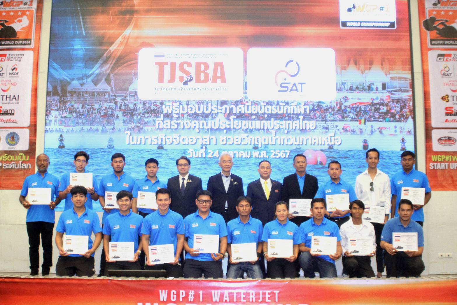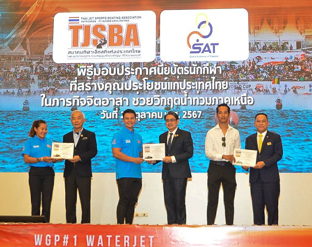 โอกาสนี้ สมาคมกีฬาเจ็ตสกีแห่งประเทศไทยฯ ได้เชิญนักกีฬาที่สร้างประโยชน์ชาติใน 2 ภารกิจ มอบประกาศนียบัตร ประกาศเกียรติคุณ ได้แก่ นักกีฬาจิตอาสาช่วยวิกฤตน้ำท่วมภาคเหนือ และทีมชาติไทยชุด 2024 ที่ร่วมกันคว้า 7 แชมป์โลก ที่สหรัฐฯ โดยในส่วนช่วยภารกิจน้ำท่วมได้แก่ ทีมของ FKT CONCRETE, LIQUI MOLY JETSKI TEAM BY NAKORN, HOUSE OF BULLDOGS YAMAHA WAVERUNNER THAILAND, PUSAN SEADOO JET SKI TEAM NAKHONPATHOM, 777 PERFORMANCE BY JUMBO TUNER, G-FORCE POWERSPORTS PATTAYA, PTT LUBRICANTS GOLD DRAGON LET’S GO GROUP, YAMAHA WAVERUNNER THAILAND X REXSAC VERTEX BY 777 PERFORMANCE, YAMAHA HERO JET BANGKOK, GAZEBO JET RACING TEAM