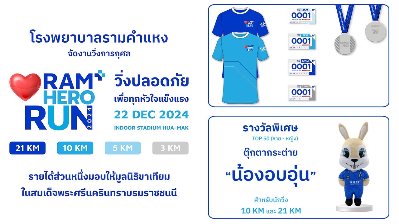 โรงพยาบาลรามคำแหง ชวนคนไทยและนักวิ่งทุกระดับร่วมภารกิจท้าทายขีดจำกัด พิชิตเป้าหมายของตัวเองในกิจกรรมวิ่งการกุศล “RAM HERO RUN 2024” วิ่งปลอดภัย เพื่อทุกหัวใจแข็งแรง กับโค้งสุดท้ายของการรับสมัคร โดยงานจะจัดขึ้นในวันอาทิตย์ที่ 22 ธันวาคม 2567 เวลา 03.00 – 12.00 น. ณ ลานหน้าอินดอร์ สเตเดียม หัวหมาก ในระยะทาง 3 กม. 5 กม. 10 กม. และ 21 กม. สำหรับเหรียญที่ระลึกและเสื้อวิ่งในปีนี้ ออกแบบในสไตล์มินิมอล น้อยแต่มาก เรียบแต่โก้ โดยเสื้อใช้โทนสีฟ้า ให้ความรู้สึกสดชื่น ผ่อนคลาย สบายตา และยังสามารถหยิบมาใส่ได้ในทุกโอกาส สมัครได้แล้วตั้งแต่วันนี้ ถึง 30 พฤศจิกายน 2567 โดยรายได้ส่วนหนึ่งมอบให้มูลนิธิขาเทียม ในสมเด็จพระศรีนครินทราบรมราชชนนี