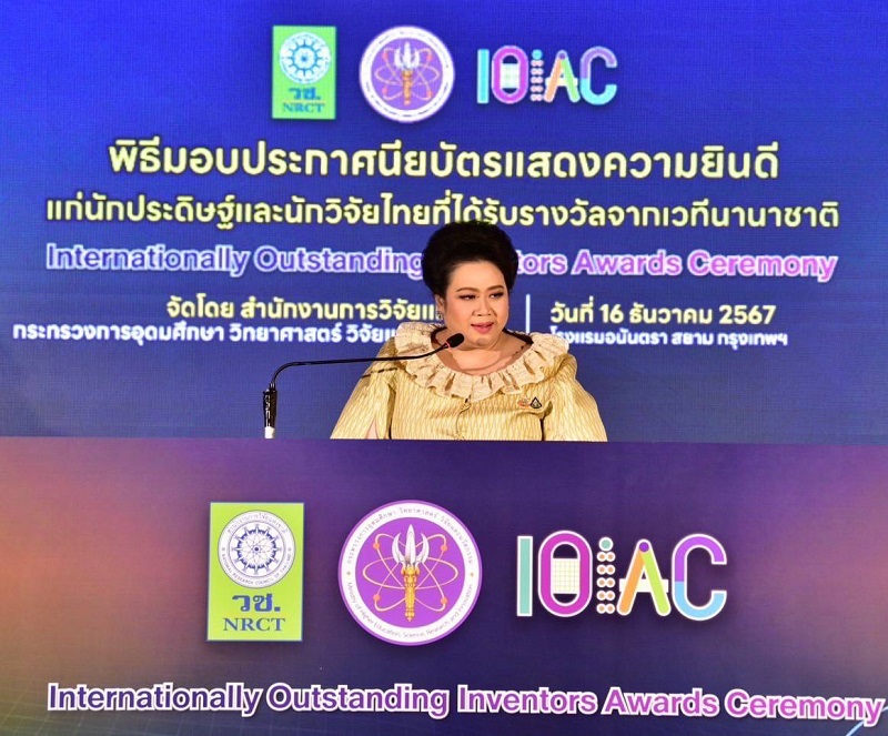 วันที่ 16 ธันวาคม 2567 กระทรวงการอุดมศึกษา วิทยาศาสตร์ วิจัยและนวัตกรรม โดย สำนักงานการวิจัยแห่งชาติ (วช.) จัดพิธีมอบประกาศนียบัตรแสดงความยินดีแก่นักประดิษฐ์และนักวิจัยไทยที่ชนะรางวัลจากเวทีนานาชาติ (Internationally Outstanding Inventors Awards Ceremony) โดยได้รับเกียรติจาก นางสาวศุภมาส อิศรภักดี รัฐมนตรีว่าการกระทรวงการอุดมศึกษา วิทยาศาสตร์ วิจัยและนวัตกรรม เป็นประธานในพิธี พร้อมด้วย ดร.วิภารัตน์ ดีอ่อง ผู้อำนวยการสำนักงานการวิจัยแห่งชาติ กล่าวรายงาน เพื่อแสดงความยินดีกับนักประดิษฐ์นักวิจัยไทยในโอกาสที่สร้างชื่อเสียงให้กับประเทศและสร้างการยอมรับในความสามารถและมาตรฐานของสิ่งประดิษฐ์นวัตกรรมฝีมือของนักประดิษฐ์นักวิจัยไทย ณ โรงแรมอนันตรา สยาม กรุงเทพฯ