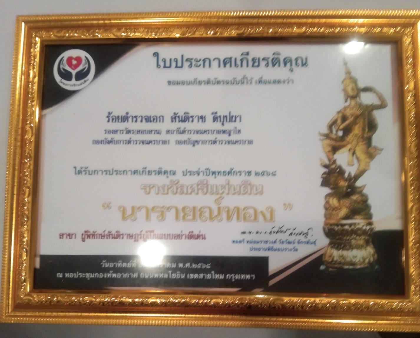 ส่วน ร.ต.อ. สันติราข ดีบุปผา รอง สว.สส.สน.พญาไท ได้รับรางวัลศรีแผ่นดิน “นารายณ์ทอง” ประจำปีพุทธศักราช 2568 สาขาผู้พิทักษ์สันติราษฎร์ผู้เป็นแบบอย่างดีเด่น ซึ่งเป็นการเชิดชูเกียรติปูชนียบุคคลต้นแบบของสังคมไทย