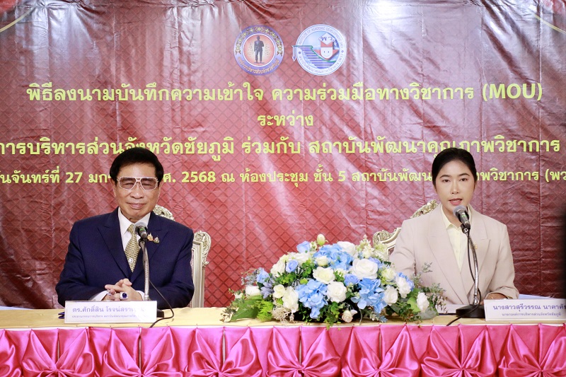 เมื่อวันจันทร์ที่ 27 มกราคม พ.ศ. 2568 เวลา 10.00-11.30 น. ณ ห้องประชุม ชั้น 5 อาคาร พว. ถนนนครไชยศรี แขวงถนนนครไชยศรี เขตดุสิต กรุงเทพมหานคร ได้มีพิธีลงนามบันทึกความเข้าใจ ความร่วมมือทางวิชาการ (MOU) ระหว่าง องค์การบริหารส่วนจังหวัดชัยภูมิ ร่วมกับ สถาบันพัฒนาคุณภาพวิชาการ (พว.) ประจำปีการศึกษา 2568-2570 โดยมีนางสาวสุรีวรรณ นาคาศัย นายกองค์การบริหารส่วนจังหวัดชัยภูมิ และ ดร.ศักดิ์สิน โรจน์สราญรมย์ ประธานกรรมการบริหาร สถาบันพัฒนาคุณภาพวิชาการ (พว.) ร่วมลงนาม การดำเนินงานตามข้อตกลงความร่วมมือนี้จะอยู่ในรูปแบบของการประสานงานความร่วมมือขององค์กรทั้งสองแห่งดังกล่าวข้างต้น โดยตระหนักถึงความสำคัญและประโยชน์ของการศึกษาที่มีการแลกเปลี่ยนเรียนรู้ซึ่งกันและกัน เมื่อวิเคราะห์ถึงด้านนโยบายด้านการศึกษาของรัฐบาล ที่จะดำเนินการปฏิรูปการศึกษาและสร้างสังคมแห่งการเรียนรู้ตลอดชีวิต อันเป็นจุดเน้นสำคัญที่มุ่งส่งเสริมให้เป็นคนดี มีวินัย ภูมิใจในชาติ รวมทั้งเสริมสร้างศักยภาพของผู้เรียนตามความถนัด ส่งเสริมการอ่าน เพื่อสร้างอนาคต สร้างรายได้ กระจายอำนาจการศึกษาให้ผู้เรียนได้เข้าถึงการเรียนรู้อย่างทั่วถึง มีสื่ออุปกรณ์การเรียนที่เหมาะสมต่อผู้เรียนแต่ละวัย และใช้ระบบเทคโนโลยีการศึกษาสมัยใหม่ในการพัฒนาหลักสูตร และให้คำแนะนำที่เหมาะสมกับความรู้ความสนใจของผู้เรียน ต่อยอดให้เกิดการพัฒนาองค์ความรู้ เทคโนโลยี และนวัตกรรม เพื่อให้มีความพร้อมต่อการเปลี่ยนแปลงทางเศรษฐกิจ สังคม และการเมืองของโลกสมัยใหม่