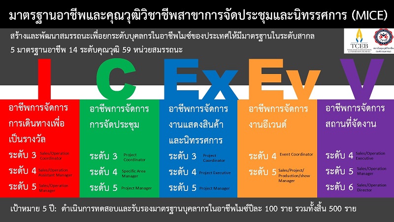 ในการยกระดับบุคคลากรไมซ์ของประเทศไทยให้ได้มาตรฐานคุณวุฒิวิชาชีพไมซ์ทั้ง 5 สาขาอาชีพโดยมีเป้าหมายให้การรับรองทั้ง 5 สาขาปีละ 100 ราย เพื่อให้สามารถสร้างบุคลากรมืออาชีพที่ผ่านการรับรองระดับชาติได้จำนวน 500 รายในอีก 5 ปีข้างหน้า