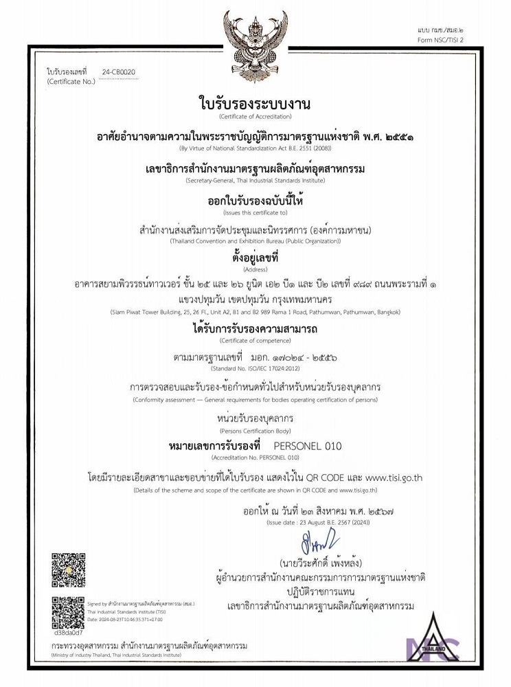 วันที่ 22 มกราคม 2568 สำนักงานส่งเสริมการจัดประชุมและนิทรรศการ (สสปน.) ได้รับการรับรองมาตรฐานสากล ISO/IEC 17024:2012 (มอก.17024-2556) ยกระดับสู่การเป็น “หน่วยรับรองบุคลากรไมซ์” ที่ได้มาตรฐานระดับสากล จากสำนักงานมาตรฐานผลิตภัณฑ์อุตสาหกรรม (สมอ.) กระทรวงอุตสาหกรรม