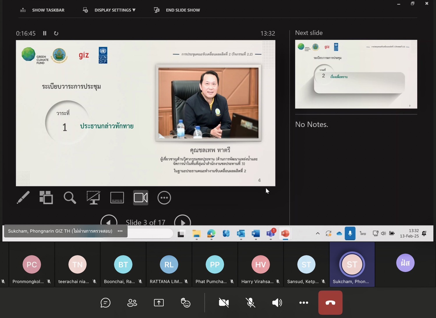 ในการประชุมครั้งนี้ คณะทำงานได้ร่วมกันหารือเกี่ยวกับการออกแบบมาตรการ EbA ที่จะดำเนินการในระยะปี 2568 – 2569 และการติดตามประเมินผลอย่างละเอียด พร้อมทั้งรับฟังความคิดเห็นจากทุกฝ่าย เพื่อให้โครงการสามารถดำเนินไปได้อย่างมีประสิทธิภาพ โดยยังได้มีการพิจารณารายละเอียดในการตรวจรับแบบก่อสร้างมาตรการ EbA รวมถึงการเตรียมความพร้อมสำหรับการประเมินผลระยะกลางที่สำคัญ