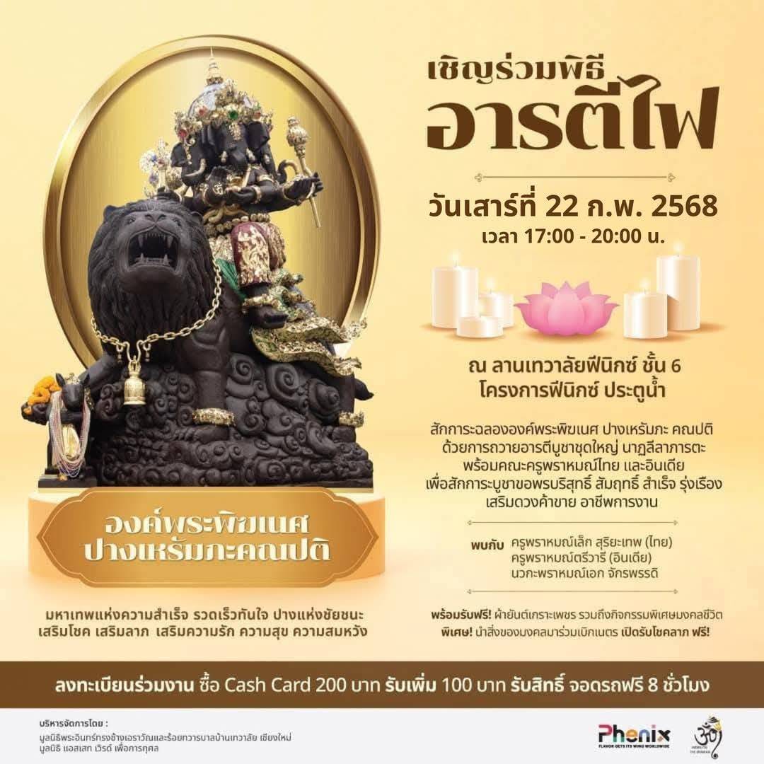 โครงการฟีนิกซ์ ประตูน้ำ เชิญชวนร่วมงานอารตีไฟ หน้าองค์พระพิฆเนศปางเหรัมภะ คณปติ 22 กุมภาพันธ์นี้ จัดงานเสาร์เว้นเสาร์ ร่วมบูชาองค์มหาเทพแห่งความสำเร็จและอำนาจบารมี