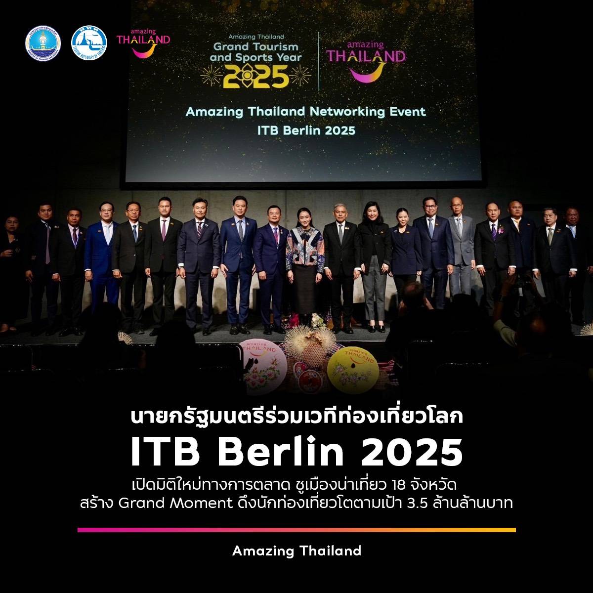 นางสาวแพทองธาร ชินวัตร นายกรัฐมนตรี  กล่าวว่า รัฐบาลมุ่งขับเคลื่อนให้ประเทศไทยเป็นจุดหมายปลายทางการท่องเที่ยวระดับโลก (World-Class Destination) ขับเคลื่อนนโยบายให้การท่องเที่ยวเป็นปัจจัยสำคัญในการกระตุ้นเศรษฐกิจของประเทศ ที่จะทำให้มีเงินหมุนเวียนในระบบในทุกระดับ โดยในปี 2568 เป็นปีพิเศษที่รัฐบาลได้ประกาศให้เป็นปี Amazing Thailand Grand Tourism and Sports Year 2025 โดยนำเสนอการท่องเที่ยวไทยผ่าน Soft Power และในงาน ITB Berlin 2025 นี้เป็นครั้งแรกที่มีการชูเมืองน่าเที่ยว 18 จังหวัดศักยภาพเข้าสู่เวทีการเสนอขายในระดับโลก อีกทั้งส่งเสริมกิจกรรมกระตุ้นการท่องเที่ยวตลอดทั้งปี  โดยเฉพาะเทศกาลสงกรานต์ ภายใต้ชื่อ Maha Songkran World Water Festival 2025, Pride Month, เทศกาลลอยกระทง และ Amazing Thailand Countdown ขณะที่เทศกาลด้านกีฬาที่สำคัญ ได้แก่ การเป็นเจ้าภาพจัดการแข่งขันวอลเล่ย์บอลหญิงชิงแชมป์โลก (FIVB Women’s Volleyball World Championship 2025) และ ซีเกมส์ 2025 โดยตั้งเป้าดึงนักท่องเที่ยวเข้าประเทศไทย 39 ล้านคน สร้างรายได้ทางการท่องเที่ยว 3.5 ล้านล้านบาทในปี 2568