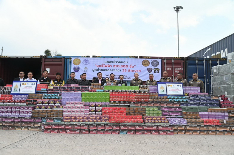 จากนโยบายของนางสาวแพทองธาร ชินวัตร นายกรัฐมนตรี มีนโยบายสั่งการให้ปราบปรามการลักลอบนำเข้า -ส่งออกบุหรี่ไฟฟ้าอย่างจริงจัง รวมถึงการลักลอบจำหน่ายบุหรี่ไฟฟ้าอย่างเร่งด่วนให้เห็นผลภายใน 30 วัน นับแต่เดือน ก.พ.2568 โดยเฉพาะกลุ่มนักเรียนและร้านค้ารอบสถานศึกษาอย่างจริงจัง ผบ.ตร.จึงได้สั่งการให้ทุกหน่วยเร่งรัดทำการติดตาม จับกุมและปราบปรามผู้ที่ลักลอบนำเข้า-ส่งออกหรือจำหน่ายบุหรี่ไฟฟ้า จนกระทั่งเมื่อวันที่ 7 มี.ค.68 เวลา 18.00 น. ก่อนเข้าทำการตรวจยึดเจ้าหน้าที่ตำรวจได้ร่วมกับเจ้าหน้าที่ศุลกากรและเจ้าหน้าที่ที่เกี่ยวข้อง สืบทราบมาว่าจะการลักลอบนำเข้าบุหรี่ไฟฟ้าเข้ามาในประเทศไทยผ่านมายังท่าเรือแหลมฉบัง จึงได้ร่วมกันเฝ้าติดตามและทำการตรวจสอบ จนสามารถตรวจยึดบุหรี่ไฟฟ้าชนิดใช้แล้วทิ้ง 6,000 ชิ้น ,น้ำยาบุหรี่ไฟฟ้า 6,000 ชิ้น ,หัวพ๊อดบุหรี่ไฟฟ้า (ภายในบรรจุน้ำยาบุหรี่ไฟฟ้า) 190,100 ชิ้น ,เครื่องบุหรี่ไฟฟ้า พร้อมน้ำยาบุหรี่ไฟฟ้า 8,200 ชิ้น รวมทั้งสิ้น 210,300 ชิ้น มูลค่ารวม 33,075,000 บาท ภายในตู้สินค้าผ่านแดน จำนวน 1 ตู้คอนเทนเนอร์ ณ ท่าเรือ LCMT (A0) สำนักงานศุลกากรท่าเรือแหลมฉบัง จึงได้ทำการตรวจยึดและขยายผลเพื่อสืบสวนหาผู้กระทำความผิดตามกฎหมายต่อไป ณ สำนักงานศุลกากรท่าเรือแหลมฉบัง อ.ศรีราชา จว.ชลบุรี