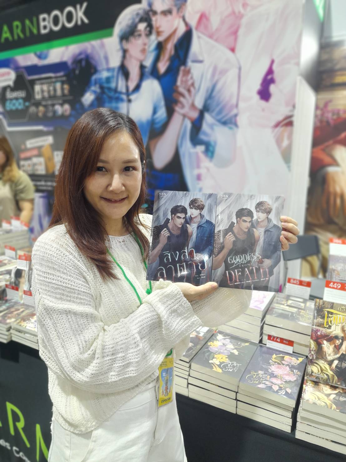และในงานนี้หนังสือของ ARNBOOK เรื่องใหม่มีแฟนตาซีวายเรื่อง ผมคือตัวบัคแห่งโลกสยองขวัญ 2 เล่มจบ, คุณวาน่ากลัวกว่าผี และ ควีนโอเมก้าของราชัน ในวันจัดบูธก็มีคนจีนมาแล้วเขาชี้ที่ Backdrop พร้อมพูดว่า อันนี้ควีนโอเมก้า เขาพูดชื่อหนังสือถูกด้วยก็ดีใจค่ะ(เล่าไปยิ้มไป) แล้วเรามีหนังสือเวอร์ชันภาษาอังกฤษเรื่องแรก “สิงสาลาตาย” ทำเพื่อแฟนคลับต่างชาติ ซึ่งกว่าจะทำเสร็จเหนื่อยมาก เพราะเป็นเล่มแรกของเราใช้เวลาเกือบปีค่ะ กว่าจะแปลเรามีการเทสนักแปลหลายคนมากกว่าจะได้คนที่โอเคสุด ซึ่งกระบวนการแปลประมาณสี่เดือน จากนั้นบก.จะตรวจซ้ำอีกที รวม ๆ แล้วใช้เวลาเรื่องนี้กว่าจะเสร็จปีนึง แล้วเรื่องสิงสาลาตายจะทำเป็นซีรีส์ช่อง GMM ค่ะ เหตุผลที่ทำเวอร์ชันภาษาอังกฤษเนื่องจากเขาซื้อลิขสิทธิ์ไปก็จะมีแฟนอินเตอร์ของนักแสดงเราก็เลยทำเป็นเวอร์ชันภาษาอังกฤษ โดยจะมีทั้งเล่มและE-BOOK ภาษาอังกฤษโหลดได้ที่ ARNBOOK ค่ะ แล้วอีกเรื่องที่จะแปลเป็นภาษาอังกฤษเรื่อง “The Fridge ย้อนเวลาเป็น ข้ามเวลาตาย” ของภาคินัย เรื่องนี้กำลังจะทำซีรีส์ช่อง MONO ในส่วนของภาษาจีนเราดิวกับไต้หวันแล้วเขาจะมาดูเรื่อง ควีนโอเมก้า กับคุณวาน่ากลัวกว่าผีด้วย แต่สิงสาลาตายเราได้ขายลิขสิทธิ์ให้ไต้หวันไปแล้วเป็นเวอร์ชันภาษาจีนแต่ยังไม่ออกมาค่ะ สำหรับปกเขาก็ซื้อไปแต่เราไม่ได้บังคับว่าต้องเป็นปกของเรา เพราะในแต่ละประเทศเทรนด์ของปกไม่เหมือนกันค่ะ ก็ขอฝากบูธ ARNBOOK ที่ N02 ด้วย ปีนี้เราขยายบูธเพื่อลูกค้าจะได้เลือกหนังสือกันสบายขึ้น เพราะทุกทีเบียดกันค่อนข้างเยอะค่ะ”