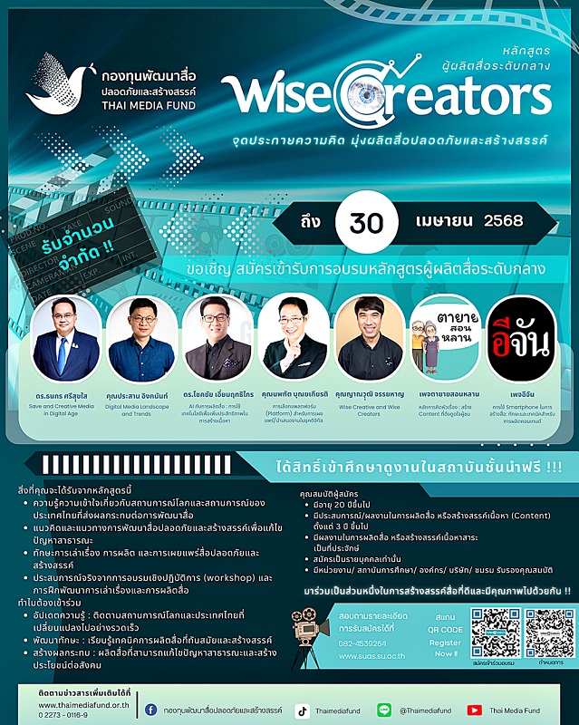 กองทุนพัฒนาสื่อปลอดภัยและสร้างสรรค์ เปิดประตูสู่โอกาสครั้งสำคัญสำหรับนักสร้างสรรค์สื่อรุ่นใหม่ไฟแรง กับหลักสูตรอบรมผู้ผลิตสื่อระดับกลาง WISE CREATORs ตั้งแต่วันนี้ ถึง 30 เมษายน 2568