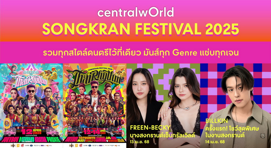 - ‘เซ็นทรัลเวิลด์’ หนึ่งเดียวแลนด์มาร์กสงกรานต์ระดับโลกใจกลางเมืองกับงาน centralwOrld Songkran Fest 2025: ผนึกพันธมิตรยักษ์ใหญ่ จัดเต็มความสนุกตลอด 6 วันเต็ม ทั้ง Thai Rhythm Songkran Festival 2025 วันที่ 12-14 เม.ย. 68 ที่ยกขบวนศิลปินสายโจ๊ะกว่า 300 ชีวิต นำโดย โจอี้ บอย, กระแต อาร์สยาม, PROXIE, D Gerrard x Zbing Z., แจ๊ส สปุ๊กนิค ปาปิยอง กุ๊กกุ๊ก, ลำไย ไหทองคำ, สิงโต นำโชค, ไททศมิตร, จ๊ะ นงผณี, ZOLAR, The Voice พร้อมกิจกรรมไทยสุดม่วนแบบจัดเต็มทั้งเวทีรำวงสุดแกลมที่ใหญ่ที่สุดในกรุงเทพฯ, สาวน้อยตกน้ำ และ Giant Slider สไลเดอร์ยักษ์ ที่จะกลับมาสร้างความชุ่มฉ่ำใจกลางเมืองอีกครั้ง ต่อด้วยงานคอนฯใหญ่ FWD Music Live Fest ครั้งที่ 4 ฟรีคอนเสิร์ตเล่นน้ำ ใจกลางลานหน้าเซ็นทรัลเวิลด์ วันที่ 18–20 เม.ย. ที่ยกทัพศิลปิน T-POP และ J-POP กว่า 60 ชีวิตมาสร้างความสนุกแบบฉ่ำสุดโมเมนต์ นำโดย Jeff Satur, PROXIE, 4EVE, Three Man Down,Tilly Birds, PERSES,THE TOYS, Tattoo Colour, PRETZELLE, ZOLAR, WOLF HOWL HARMONY และอีกมากมาย ตอกย้ำตำแหน่ง The No.1 Culturetainment Landmark ที่รวมทุกจังหวะความสนุกของเทศกาลสงกรานต์ไว้ในที่เดียวอย่างแท้จริง