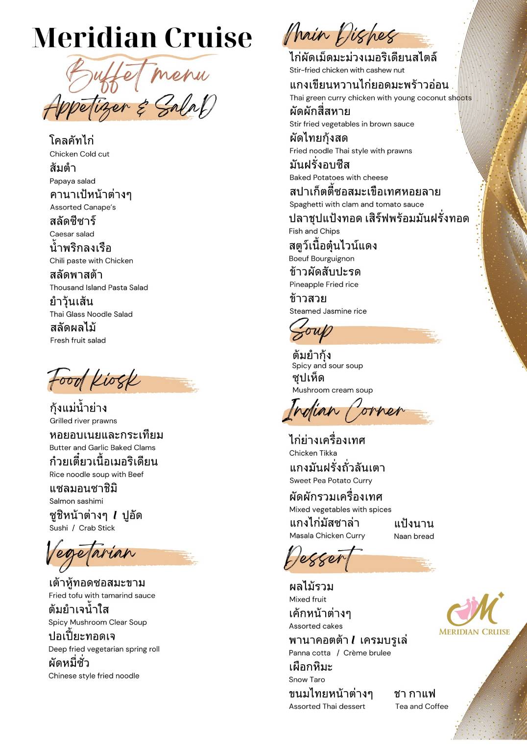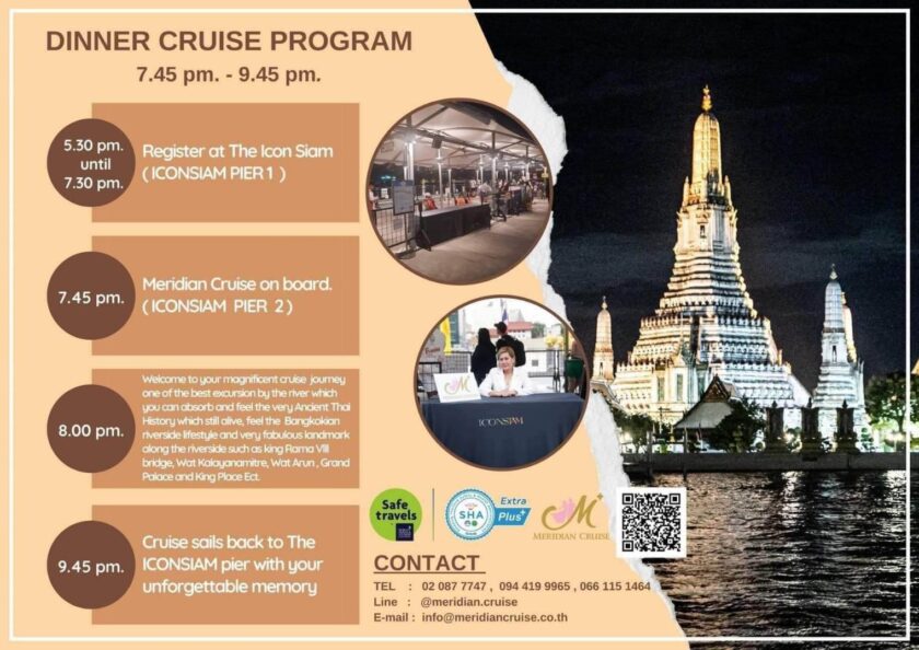 Meridian Cruise 2 เปิดประสบการณ์แห่งความสุขบนสายน้ำเจ้าพระยา ชวนทุกครอบครัวมาสัมผัสมื้ออาหารแสนพิเศษบนเรือหรู พร้อมชมวิวสองฝั่งแม่น้ำยามเย็นและค่ำคืน กับบุฟเฟต์นานาชาติสุดอลังการ ที่จัดเต็มทั้งซีฟู้ด กุ้งแม่น้ำย่าง หอยอบเนย แซลมอนซาชิมิ ซูชิหลากหน้า ขนมหวานพรีเมียมอย่างพานาคอตต้า และเครมบรูเล่ เคล้าดนตรีสดจาก Live Band ตลอดการล่องเรือ