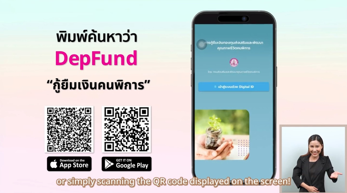 สำหรับขั้นตอนการดาวน์โหลดและสมัครใช้งานแอปพลิเคชันกู้ยืมเงินกองทุนส่งเสริมและพัฒนาคุณภาพชีวิตคนพิการ หรือ DepFund สามารถรับชมได้ที่ https://www.facebook.com/share/v/1AZtgLxRc7/