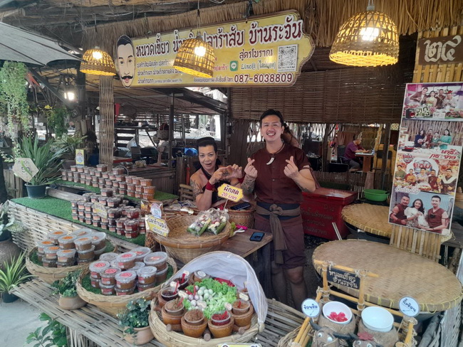 “ขอแนะนำตัวก่อนผมทำงานเป็นประชาสัมพันธ์อยู่ที่ร้านเกษราเบเกอรี่ครับ ส่วนพี่อีกคนเป็นสมาชิก อบต ครับ(ใส่ชุดนักรบอยู่ซุ้มด้วยกัน) สาเหตุที่มาเปิดขาย “ปลาร้าสับหนวดเขี้ยวสิงห์บุรี” ในตลาดย้อนยุคบ้านระจันที่เปิดมาประมาณ 9 ปีแล้ว เปิดเฉพาะเสาร์ – อาทิตย์ และวันนักขัตฤกษ์ด้วยครับ ที่นี่เป็นสาขาแรกที่ผมเปิดขายปลาร้าสับ เริ่มแรกเจ้าอาวาสเป็นผู้ก่อตั้งตลาด แล้วก็จะมีกลุ่มนักรบย้อนยุคชวน ๆ กันมา แรก ๆ ผมไม่รู้จะขายอะไร เลยลองทำปลาร้าที่ไม่เหมือนใครก็พัฒนามาเรื่อย ๆ ที่ดังของร้านคือ ปลาร้าสับ เผ็ดน้อย กับ ปลาร้าบองเผ็ดแซ่บ ราคากระปุกเล็ก 50 กระปุกใหญ่ 80 บาทครับ