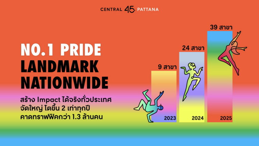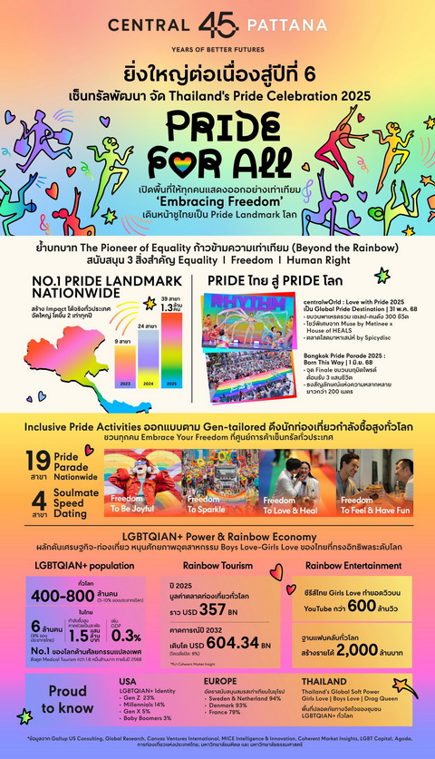 กรุงเทพฯ – บริษัท เซ็นทรัลพัฒนา จำกัด (มหาชน) ผู้นำอสังหาริมทรัพย์ของไทยและผู้บริหารศูนย์การค้าเซ็นทรัลทั่วประเทศ ย้ำบทบาท The Pioneer of Equality ผู้ริเริ่มงานฉลองเดือนแห่งความภาคภูมิใจ Pride month ต่อเนื่องปีที่ 6 ประกาศความยิ่งใหญ่เปิดพื้นที่ศูนย์การค้าเซ็นทรัลทั่วประเทศ เป็นพื้นที่การแสดงออกความเป็นตัวตนอย่างเท่าเทียม ภายในงาน Thailand’s Pride Celebration 2025 “Pride For All” ชูศักยภาพประเทศไทยสู่การเป็นเจ้าภาพ World Pride 2030 เดินหน้าปลุกภาคเศรษฐกิจ-ท่องเที่ยว ไตรมาส 2 และหนุนอุตสาหกรรมบันเทิง Boys Love-Girls Love ของไทยที่มีอิทธิพลระดับโลก
