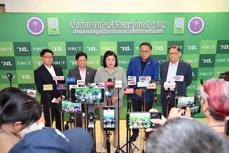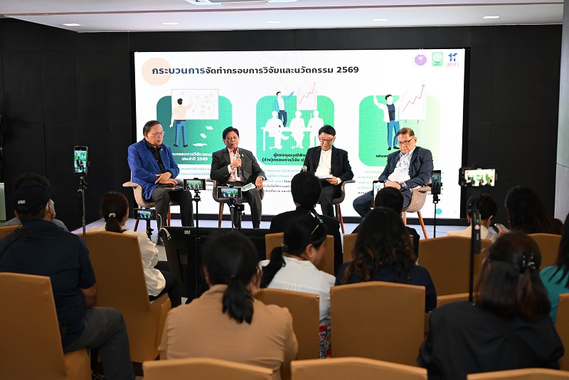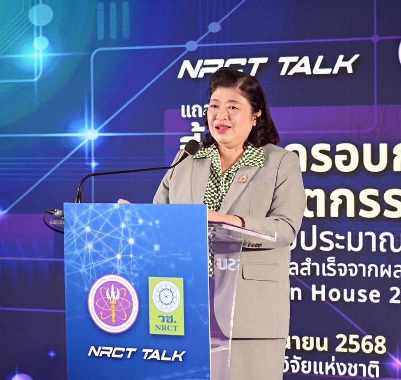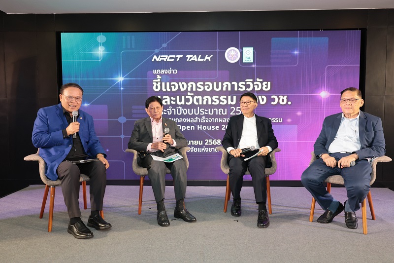 วันที่ 15 มิถุนายน 2568 สำนักงานการวิจัยแห่งชาติ(วช.) กระทรวงการอุดมศึกษา วิทยาศาสตร์ วิจัยและนวัตกรรม จัดงานแถลงข่าว NRCT Talk เรื่อง “ชี้แจงกรอบการวิจัยและนวัตกรรม ของ วช. ประจำปีงบประมาณ 2569 และการแถลงผลสำเร็จจากผลงานวิจัยและนวัตกรรม (NRCT Open House 2025)” โดย ดร.วิภารัตน์ ดีอ่อง ผู้อำนวยการสำนักงานการวิจัยแห่งชาติ เป็นประธานในพิธี พร้อมด้วย ดร.วิจารย์ สิมาฉายา กรรมการดำเนินงานสนับสนุนการวิจัยและนวัตกรรมประเด็นเป้าหมายด้านการพัฒนาสุขภาพสังคมและสิ่งแวดล้อม, ศาสตราจารย์ ดร.สนิท อักษรแก้ว ประธานคณะกรรมการดำเนินงานสนับสนุนการวิจัยและนวัตกรรมประเด็นเป้าหมายด้านการพัฒนาสุขภาพสังคมและสิ่งแวดล้อม, ศาสตราจารย์ ดร.วันชัย ดีเอกนามกูล กรรมการด้านการพัฒนาเส้นทางอาชีพนักวิจัย และรองศาสตราจารย์ ดร.กล้าณรงค์ ศรีรอต ประธานคณะกรรมการดำเนินงานสนับสนุนการวิจัยและนวัตกรรมประเด็นเป้าหมายด้านการพัฒนาเศรษฐกิจและการเกษตร ร่วมเสวนาวิชาการ ณ ศูนย์สารสนเทศกลางด้านวิทยาศาสตร์ วิจัยและนวัตกรรม วช.