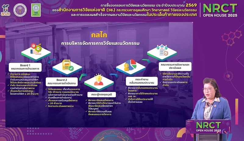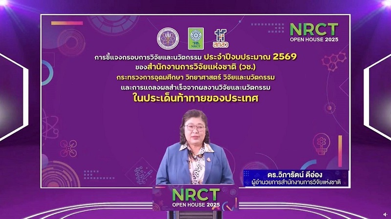 วันที่ 23 มิถุนายน พ.ศ. 2568 สำนักงานการวิจัยแห่งชาติ (วช.) กระทรวงการอุดมศึกษา วิทยาศาสตร์ วิจัยและนวัตกรรม จัดกิจกรรมเปิดบ้านชี้แจงกรอบการวิจัยและนวัตกรรม ประจำปีงบประมาณ 2569 (NRCT Open House 2025) และการแถลงผลสำเร็จจากผลงานวิจัยและนวัตกรรม “ด้านสังคมและความมั่นคง” เพื่อประชาสัมพันธ์การรับข้อเสนอการวิจัยและนวัตกรรม และกรอบการวิจัยและนวัตกรรม ประจำปีงบประมาณ 2569 โดยมี ดร.วิภารัตน์ ดีอ่อง ผู้อำนวยการสำนักงานการวิจัยแห่งชาติ เป็นประธานเปิดงาน ณ ห้องประชุมจอมพลสฤษดิ์ ธนะรัชต์ ชั้น 2 อาคาร วช.1