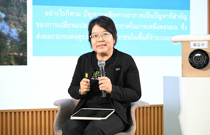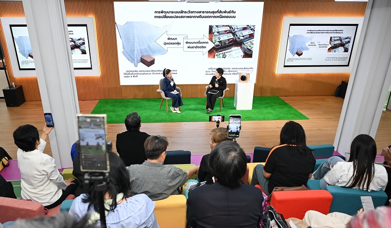 ถัดมา เป็นช่วงเสวนาในกิจกรรม NRCT Talk โดย รองศาสตราจารย์ ดร.วราภรณ์ บุญเชียง รองคณบดีคณะสาธารณสุขศาสตร์ มหาวิทยาลัยเชียงใหม่ นำเสนอนวัตกรรม “มุ้งกรองฝุ่น PM2.5” ที่ออกแบบโดยใช้หลักการ “ห้องแรงดันบวก (Positive Pressure)” ร่วมกับการควบคุมทิศทางการไหลของอากาศ เพื่อให้เกิดพื้นที่ปลอดภัยจากฝุ่นละอองในสภาพแวดล้อมที่ไม่สามารถติดตั้งเครื่องฟอกอากาศได้อย่างทั่วถึง