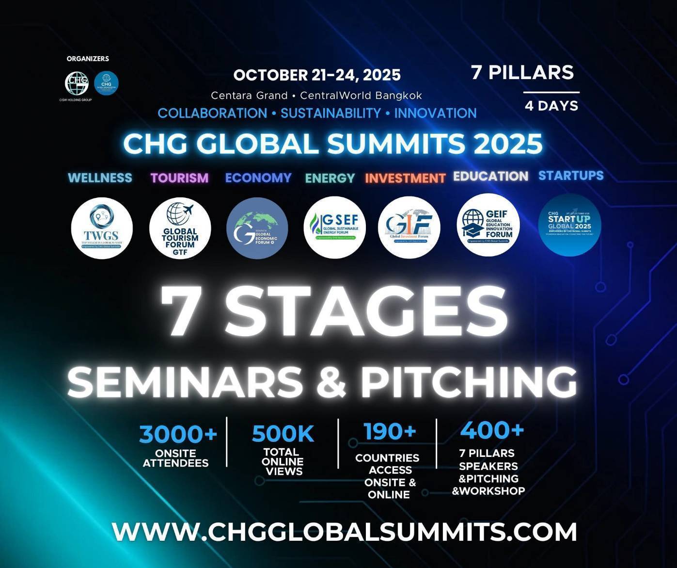 CHG Global Organization กลุ่มบริษัท CISW Holding Group โดย Mr. Jacky Ong ประธานจัดงาน CHG Global Summits 2025 กล่าวว่า ในระหว่าง วันที่: 21 ถึง 24 ตุลาคม 2568 เวลา: 09.00–22.00 น. สถานที่: ณ Centara Grand CentralWorld กรุงเทพฯ จะมีการจัดงาน CHG Global Summits 2025 ซึ่งครอบคลุมใน 7 ด้าน ที่สำคัญ ได้แก่