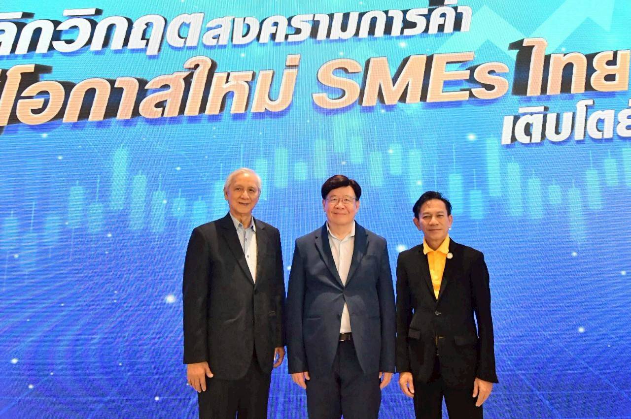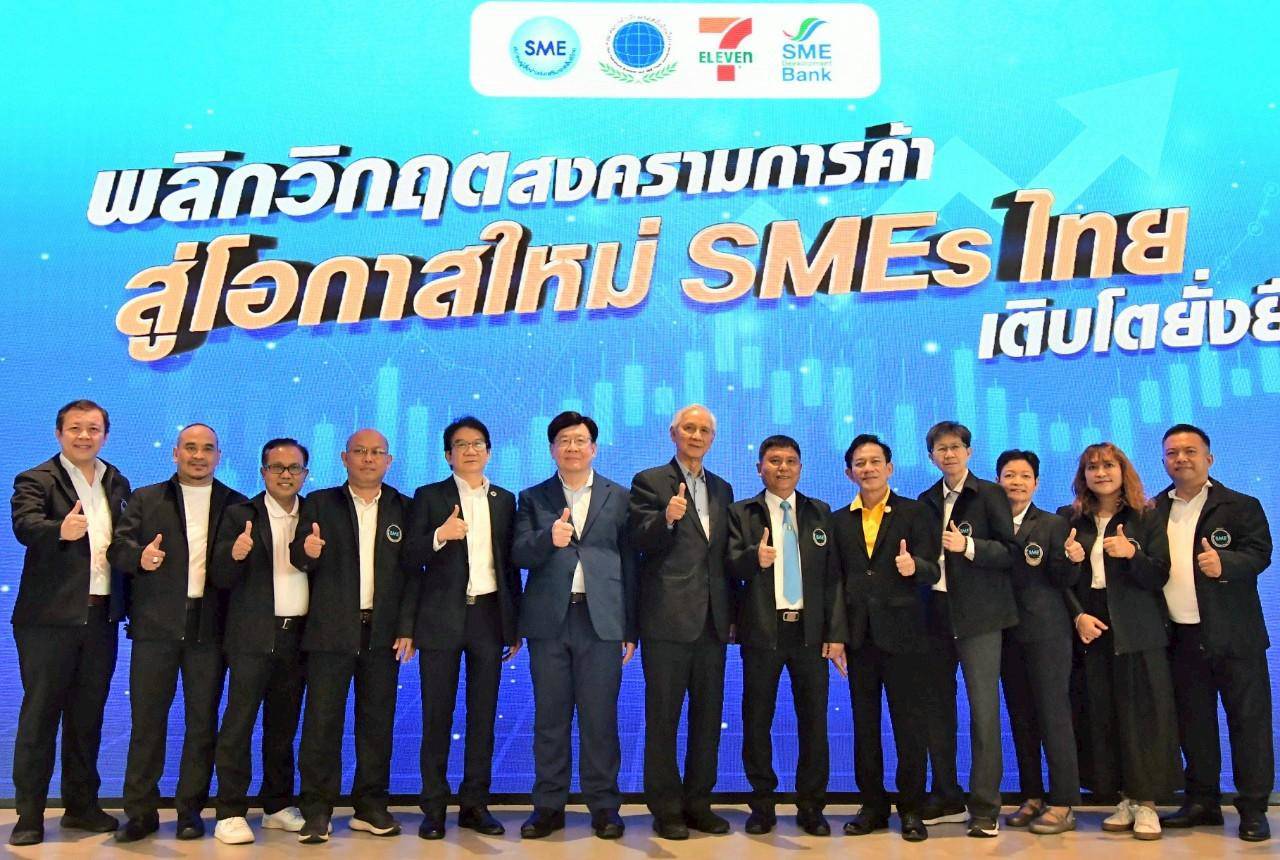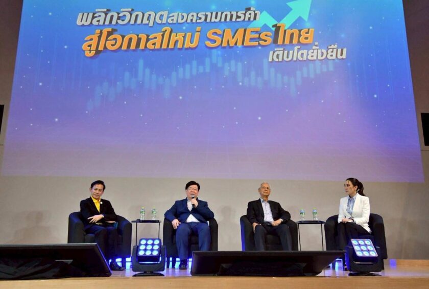 สมาคมผู้สื่อข่าวส่งเสริมเอสเอ็มอีไทย ร่วมกับ สมาคมการค้าปลีกและเอสเอ็มอีทุนไทย SME D Bank, ธนาคารพัฒนาวิสาหกิจขนาดกลางและขนาดย่อมแห่งประเทศไทย (SME D Bank) และ ร้านสะดวกซื้อ 7-Eleven จัดเสวนาหัวข้อ “พลิกวิกฤตสงครามการค้า สู่โอกาสใหม่ SMEs ไทยเติบโตยั่งยืน” เพื่อเสริมสร้างองค์ความรู้ มุมมอง และแนวทางที่เป็นประโยชน์ต่อผู้ประกอบการเอสเอ็มอี ในการเผชิญหน้ากับสถานการณ์ที่ท้าทายในปัจจุบัน โดยมี รศ.ดร.สมภพ มานะรังสรรค์ อธิการบดี สถาบันการจัดการปัญญาภิวัฒน์ ผู้เชี่ยวชาญด้านจีนศึกษาชั้นแนวหน้าของประเทศไทย, นายสุวิทย์ กิ่งแก้ว นายกสมาคมการค้าปลีกและเอสเอ็มอีทุนไทย และ นายอนุพงษ์ แสงอรุณทอง ผู้ช่วยกรรมการผู้จัดกา  SME D Bank ร่วมเสวนา โดยมีผู้สนใจทั้งผู้ประกอบการเอสเอ็มอี, นักเรียนนิสิตนักศึกษา และสื่อมวลชน เข้าร่วมรับฟังเป็นจำนวนมาก