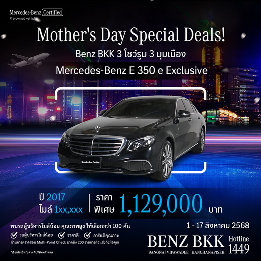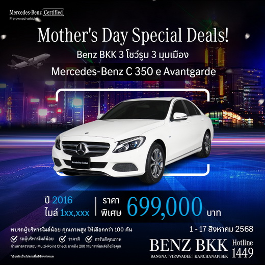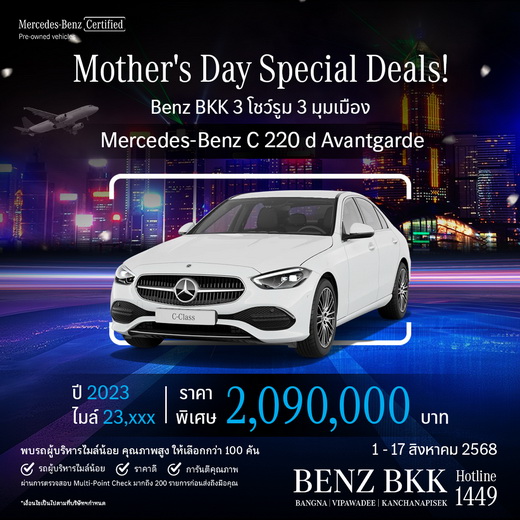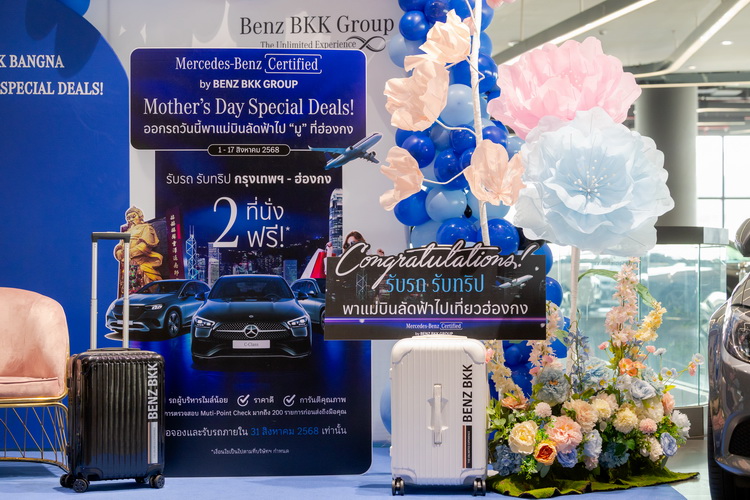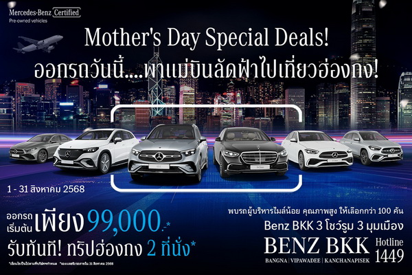 Benz BKK Group จัดแคมเปญ “Mother’s Day Special Deals!”  ซื้อรถเบนซ์มือสอง รับทริปสุดเอ็กซ์คลูซีฟ กรุงเทพฯ–ฮ่องกง 2 ที่นั่ง ฟรี! ข้อเสนอสุดพิเศษ ฉลองวันแม่ 7–17 สิงหาคม 2568 ที่โชว์รูม 3 มุมเมือง บางนา – วิภาวดี – กาญจนาภิเษก