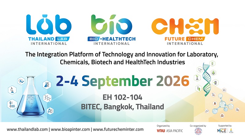 Thailand LAB INTERNATIONAL, Bio+ HealthTech INTERNATIONAL และ FutureCHEM INTERNATIONAL 2026 จะจัดขึ้นระหว่างวันที่ 2–4 กันยายน 2569 ณ ฮอลล์ EH 102–104 ไบเทค กรุงเทพฯ เข้าร่วมกับเราในแพลตฟอร์มชั้นนำของเอเชียด้านนวัตกรรมห้องปฏิบัติการ ชีววิทยาศาสตร์ และเคมี