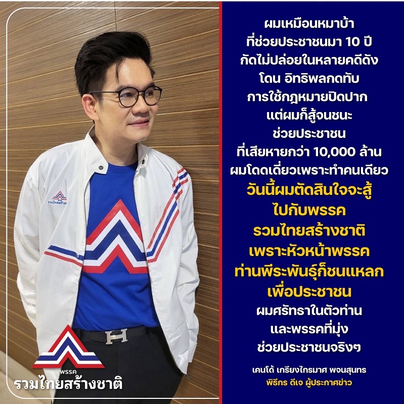 ได้คุยกับพรรคการเมืองหลายพรรคมาแล้ว จนในที่สุดเขาก็ได้ตัดสินใจร่วมเดินหน้าไปกับพรรครวมไทยสร้างชาติ เพราะเขาได้ทำการศึกษามาอย่างดีแล้วว่าเป็นพรรคที่ยึดมั่นในสถาบันหลักของชาติ เพราะฉะนั้นไม่ขายชาติแน่นอน รวมถึงพรรครวมไทยสร้างชาติได้ยึดถือความซื่อสัตย์สุจริตเป็นที่ตั้ง ดังที่เห็นได้จากความไม่พอใจของนายทุนพลังงาน ตามที่เป็นข่าวไปก่อนหน้านี้ และเป็นพรรคที่เห็นผลประโยชน์ของประชาชนเป็นที่ตั้ง ดูได้จากการตรึงราคาก๊าชหุงต้ม การลดราคาค่าไฟอย่างต่อเนื่อง รวมทั้งการเสนอแก้ไขกฎหมายเรื่องน้ำมันอีกด้วย
