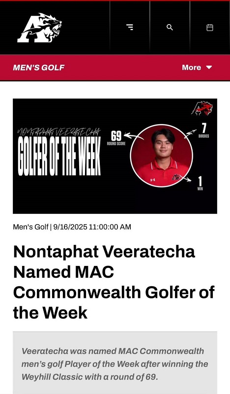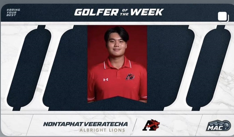 นนทภัทร วีระเตชะ นักกอล์ฟปีสอง ชาวไทย จากทีม Albright Lions สร้างชื่อเสียงให้กับประเทศอย่างต่อเนื่องในเวทีระดับมหาวิทยาลัยของสหรัฐอเมริกา ล่าสุดเขาประสบความสำเร็จอย่างยิ่งใหญ่ด้วยการคว้าแชมป์กอล์ฟระดับมหาวิทยาลัยจากรายการ Weyhill Classic และยังได้รับการยกย่องให้เป็น นักกอล์ฟชายยอดเยี่ยมประจำสัปดาห์ (Golfer of the Week) ของกลุ่มการแข่งขัน Middle Atlantic Conference (MAC) ดิวิชั่น Commonwealth ซึ่งเป็นรางวัลอันทรงคุณค่าที่บ่งชี้ถึงความก้าวหน้าในเส้นทางสู่การเป็นนักกอล์ฟอาชีพของเขา