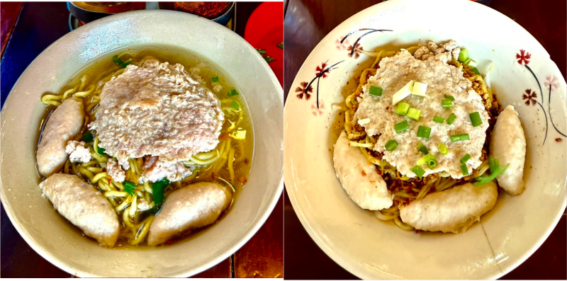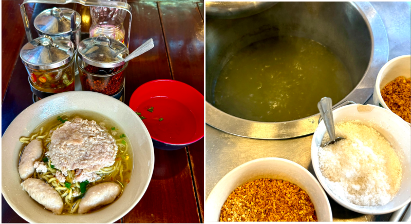 สำหรับก๋วยเตี๋ยวหมูหรือบะหมี่สูตรโบราณร้านนายเท้าทางเจ้าของร้านก็เล่าเรื่องราวให้หนุ่ม-สุทนฟังว่าแต่เดิมในชามก๋วยเตี๋ยวหมูจะมีหมูบะช่อใส่มาแต่ลูกค้าจะบอกว่าให้หมูน้อยจัง!!!ต่อมาทางเจ้าของร้านจึงคิดทำสูตรเป็นหมูแผ่นขึ้นมาเพื่อเพิ่มรสชาติความอร่อยและดูว่ามีหมูแผ่นใหญ่ด้วยดูแล้วน่ากินจ้าฮ่า ๆ นี่เองจึงเป็นที่มาของก๋วยเตี๋ยวหมูแผ่นของร้าน ส่วนอีกหนึ่งสูตรคือการต้มน้ำซุปของร้านนายเท้าจะต้องใช้น้ำประปาเท่านั้นมีเหตุผลเพราะน้ำประปาพอต้มกับกระดูกหมู(ห้ามทุบกระดูกหมู)และน้ำต้องเดือดมาก ๆ ประมาณ 1 ชั่วโมง ก็จะได้รสชาติน้ำซุปก๋วยเตี๋ยวรสชาติหวานตามธรรมชาติของกระดูกหมูอะฮิ ๆ เป็นเรื่องเล่าที่น่าสนใจส่วนเรื่องของก๋วยเตี๋ยวหมูที่ขายทางเรือน่าจะเริ่มในปี 2484-2485 เพราะเกิดน้ำท่วมใหญ่ในพื้นหลายแห่งของแผ่นดินสยามประเทศหรือมาเป็นประเทศไทยแล้วชาวจีนสมัยนั้นก็พายเรือขายก๋วยเตี๋ยวไปตามบ้านเรือนริมคลองหรือสายน้ำต่าง ๆ และสมัยก่อนนั้นมีก๋วยเตี๋ยวหมูน้ำใสหรือก๋วยเตี๋ยวหมูแห้งเท่านั้นยังไม่มีก๋วยเตี๋ยวต้มยำจ้า