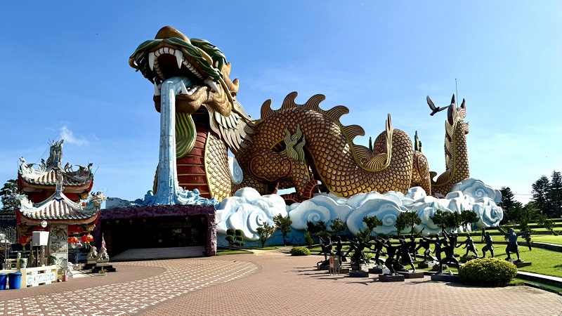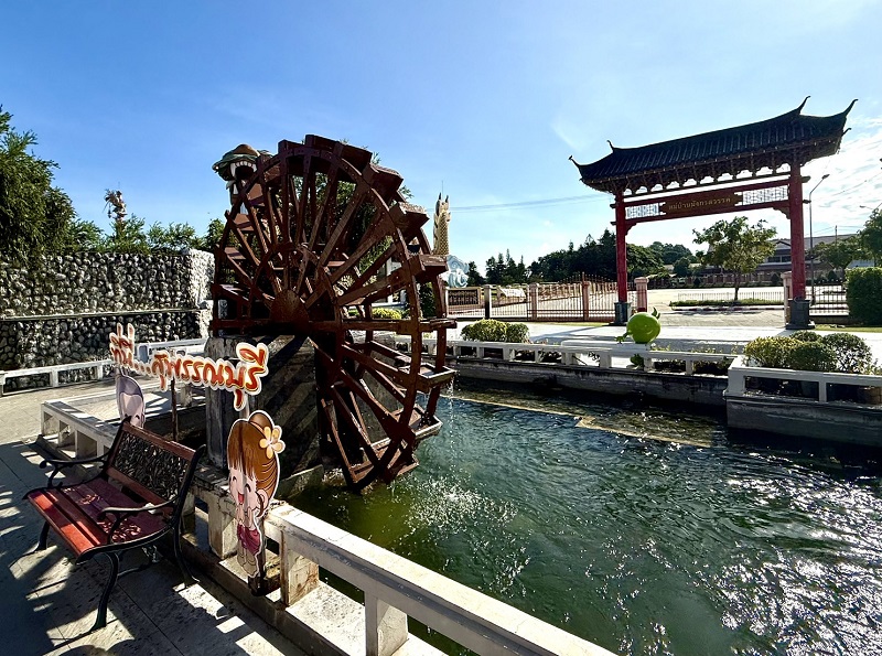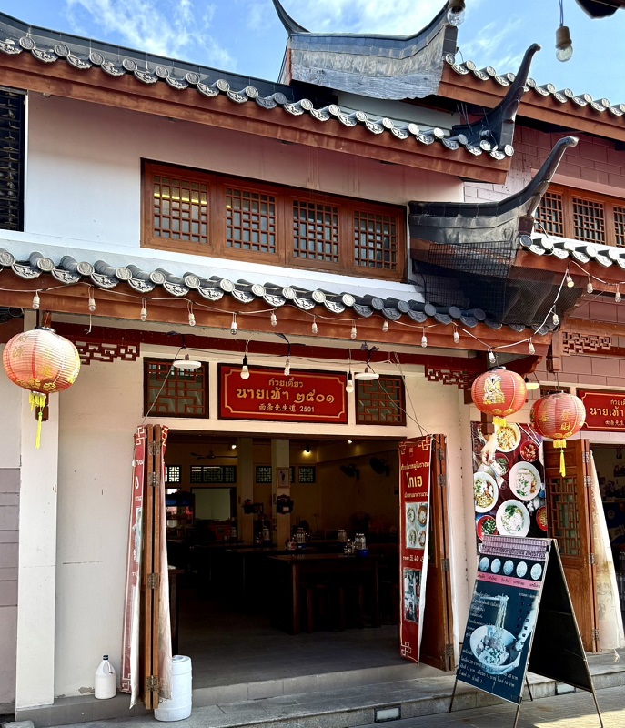 เสร็จแล้วก็เข้าใน “หมู่บ้านมังกรสวรรค์” มีร้านต่าง ๆ อยู่หลายร้านแต่วันนี้ขอแนะนำให้เข้าในร้านก๋วยเตี๋ยวหมูโบราณชื่อ “ร้านนายเท้า ๒๕๐๑” เป็นก๋วยเตี๋ยวหมูสูตรโบราณแท้ ๆ ในลุ่มน้ำเมืองสุพรรณบุรีโดยเริ่มตั้งแต่อาเตี่ยพายเรือก๋วยเตี๋ยวหมูมานานแต่ทุกนี้ก็มาเป็นรุ่นลูกก็้เปิดร้านในหมู่บ้านมังกรสวรรค์สำหรับร้านนายเท้า ๒๕๐๑ น่าสนใจมาก ๆ มีเส้นเล็กหรือบะหมี่เหลืองทองของชาวจีนในสุพรรณบุรีแท้จริง ถ้าชอบกินบะหมี่แห้งก็สั่งได้หรือบะหมี่น้ำใสหรือบะหมี่ต้มยำสูตรโบราณฮ่า ๆ อร่อยถูกใจเพราะมีลูกชิ้นหมูและหมูแผ่นใหญ่ใส่มาดูแล้วน่ากินมาก ๆ https://maps.app.goo.gl/zQgxhrJ6uReFH1a79