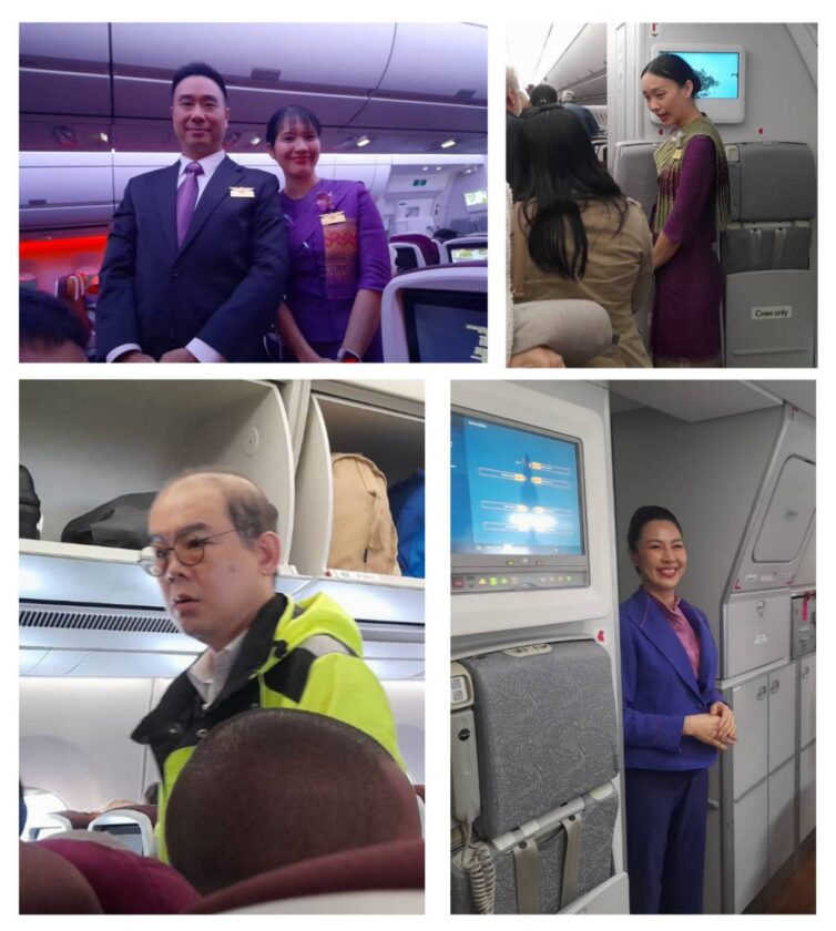 แล้วหลังจากย้ายที่นั่งเรียบร้อยก็ยกมือถือถ่ายภาพบนเครื่องเป็นที่ระลึกกับคุณสามี มีสจ๊วตยินดีถ่ายภาพให้เราสองคนซึ่งแน่นอนต้องสวยกว่าเซลฟี แต่เราเกิดความประทับใจครั้งที่สองจึงขอถ่ายภาพกับสจ๊วตเก็บไว้ชื่นชม และเพื่อเขียนข่าวเที่ยวบินนี้ หลังจากถ่ายภาพแล้วเครื่องก็ขึ้นอย่างสง่างามอย่างที่เรารู้สึก แล้วเพียงไม่นานบรรดาแอร์โฮสเตสและสจ๊วตก็เริ่มเสิร์ฟอาหารโดยเราได้รับการดูแลจากสจ๊วตที่ถ่ายภาพคู่ให้กับเรา ตลอดเที่ยวบินแอร์ฯและสจ๊วตต่างทำหน้าที่โดยไม่ลืมยิ้มถึงแววตาให้กับผู้โดยสารทุกคน นี่ไม่ได้อวย ทว่าเรารู้สึกจริง และรับรู้ได้จากการบริการที่ทุกคนตั้งใจมอบให้ผู้โดยสารตลอดเที่ยวบินนั้นอย่างไม่ขาดตกบกพร่อง
