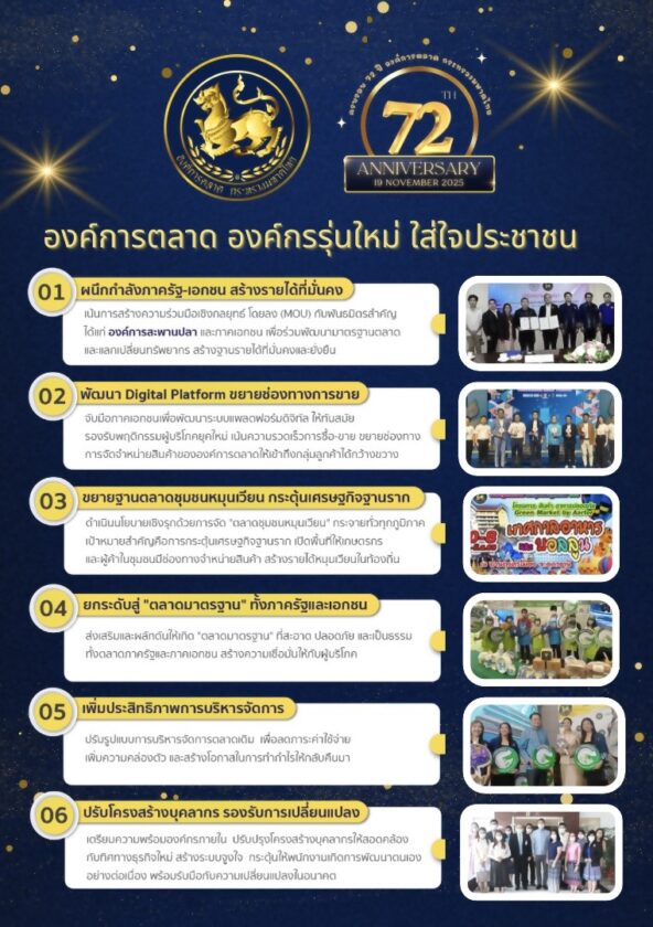 วันพุธที่ 19 พฤศจิกายน 2568 — องค์การตลาด กระทรวงมหาดไทย จัดพิธีทำบุญวันสถาปนาครบรอบ 72 ปี ณ สำนักงานองค์การตลาด โดยมี นายบูรณิศ ยุกตะนันทน์ ผู้อำนวยการองค์การตลาด เป็นประธานในพิธี พร้อมคณะผู้บริหาร พนักงาน ลูกจ้าง และสื่อมวลชน เข้าร่วมอย่างพร้อมเพรียง