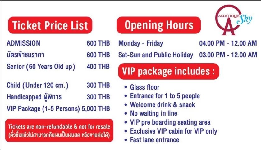 หนึ่งในไฮไลต์ที่พลาดไม่ได้คือ ASIATIQUE SKY ชิงช้าสวรรค์ขนาดใหญ่ จุดชมวิว 360 องศา ที่สามารถมองเห็นโค้งน้ำเจ้าพระยาและทิวทัศน์กรุงเทพฯ ในยามค่ำคืนอย่างสวยงาม โดยมีอัตราค่าบริการดังนี้