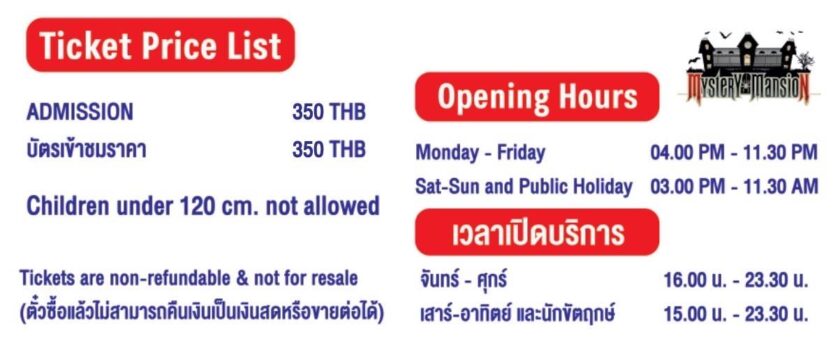 อีกหนึ่งเครื่องเล่นยอดนิยมคือ Mystery Mansion บ้านลึกลับ ที่สร้างประสบการณ์สุดตื่นเต้นเร้าใจ เหมาะกับผู้ที่ชอบความท้าทาย โดยบัตรเข้าชมราคา 300 บาท (คนไทยและต่างชาติ) และ งดให้บริการสำหรับเด็กที่มีความสูงต่ำกว่า 120 ซม. เพื่อความปลอดภัย
