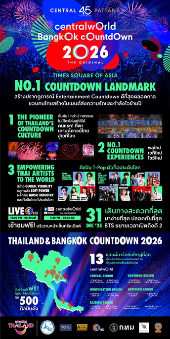 นอกจากนี้ พบกับ Thailand Countdown 2026 ณ ศูนย์การค้าเซ็นทรัลทั่วไทย ผ่านปรากฏการณ์ “Love Unites Us All” กับการจุดพลุ Synchronize นับแสนลูก รวมศิลปินไทยตัวท็อป กว่า 500 ชีวิต ครอบคลุมทุกแนวเพลง อาทิ โบกี้ไลออน, URBOYTJ, Tattoo Colour, Three Man Down, 4EVE, ไทยทศมิตร, PARADOX, Silly Fools และ ZEAL เป็นต้น แสงสีเสียงกระหึ่มทั่วไทย เซ็นทรัล เชียงใหม่ เคานต์ดาวน์ใหญ่ที่สุดภาคเหนือ และ เซ็นทรัล ขอนแก่น และโคราช แลนด์มาร์กภาคอีสาน เป็นต้น เตรียมพบกับปรากฎการณ์ Countdown Entertainment ยิ่งใหญ่ระดับโลก ส่งท้ายปี ‘centralwOrld Bangkok Countdown 2026 The Original – A Tribute To Love’ และมันส์ทั่วประเทศในงาน “Thailand Countdown 2026 – Love Unites Us All” คลิก : https://bit.ly/4ponQVA