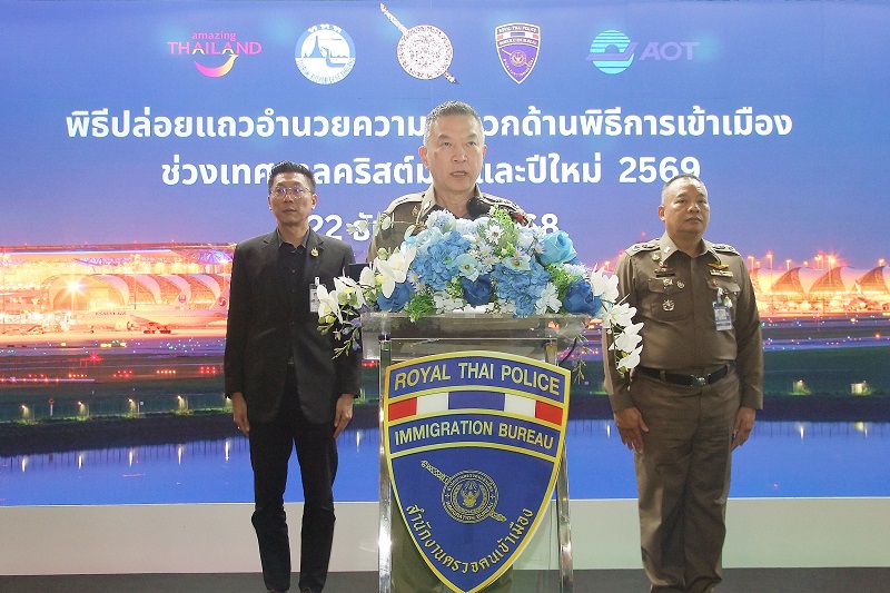 มุ่งสร้างความประทับใจตั้งแต่ก้าวแรก สะท้อนความทุ่มเทของเจ้าหน้าที่ตรวจคนเข้าเมือง สํานักงานตรวจคนเข้าเมือง ร่วมกับ การท่องเที่ยวแห่งประเทศไทย เดินหน้ายกระดับการดูแลและอํานวยความสะดวกด้านพิธีการเข้า เมืองในช่วงเทศกาลคริสต์มาสและปีใหม่ 2569 เพื่อรองรับการเดินทางของนักท่องเที่ยวทั้งชาวไทยและชาวต่างประเทศที่คาดว่าจะ เพิ่มสูงขึ้นอย่างต่อเนื่อง พร้อมสร้างความเชื่อมั่นในความปลอดภัย และสร้างความประทับใจตั้งแต่ก้าวแรกที่เดินทางถึงประเทศไทย การดําเนินการครั้งนี้เป็นไปตามนโยบายของ พลตํารวจโท ภาณุมาศ บุญญลักษณ์ ผู้บัญชาการสํานักงานตรวจคนเข้าเมือง ที่ให้ความ สําคัญกับการเตรียมความพร้อมเชิงรุกในทุกมิติ สอดรับกับนโยบายรัฐบาลด้านการท่องเที่ยวที่มุ่งเน้น “คุณภาพมากกว่าปริมาณ (VALUE OVER VOLUME)” ภายใต้แนวคิด “STAY FOCUS” ทํางานอย่างมีเป้าหมาย ใช้ข้อมูลเป็นฐาน และบูรณาการความร่วม มือทุกภาคส่วนอย่างมืออาชีพ ระดมกําลังเต็มพิกัด ดูแลนักท่องเที่ยวช่วงเทศกาลสําคัญ