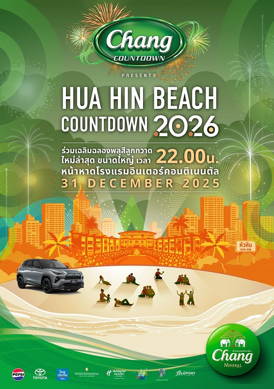 ชวนจูงมือครอบครัว คนรัก และเพื่อน ๆ มาร่วมเติมสีสันแห่งความสุข ต้อนรับปีใหม่ 2026 ไปด้วยกัน ในงาน “Chang Countdown present Hua Hin Beach Countdown 2026” วันที่ 31 ธันวาคม 2568 ตั้งแต่เวลา 18.00 น. เป็นต้นไป ณ ริมหาดอินเตอร์คอนติเนนตัล หัวหิน รีสอร์ท และ โรงแรมอินเตอร์คอนติเนนตัล ภูเก็ต รีสอร์ท
