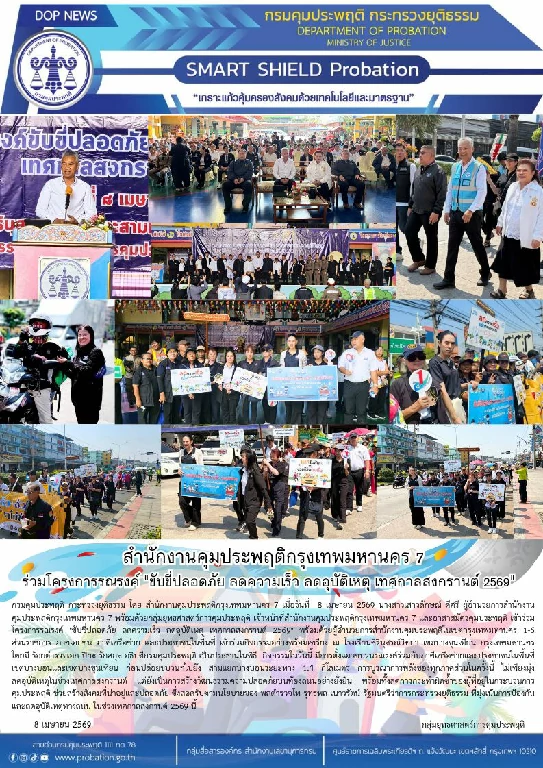 กรมคุมประพฤติ กระทรวงยุติธรรม โดย สำนักงานคุมประพฤติกรุงเทพมหานคร 7 เมื่อวันที่ 8 เมษายน 2569 นางสาวเสาวลักษณ์ ดีศรี ผู้อำนวยการสำนักงาน คุมประพฤติกรุงเทพมหานคร 7 พร้อมด้วยกลุ่มยุทธศาสตร์การคุมประพฤติ เจ้าหน้าที่สำนักงานคุมประพฤติกรุงเทพมหานคร 7 และอาสาสมัครคุมประพฤติ เข้าร่วมโครงการรณรงค์ “ขับขี่ปลอดภัย ลดความเร็ว ลดอุบัติเหตุ เทศกาลสงกรานต์ 2569” พร้อมด้วยผู้อำนวยการสำนักงานคุมประพฤติในเขตกรุงเทพมหานคร 1-6 ส่วนราชการ ภาคเอกชน ภาคีเครือข่าย และประชาชนในพื้นที่ เข้าร่วมกิจกรรมอย่างพร้อมเพรียง ณ โรงเรียนศิรินุสรณ์วิทยา เขตบางขุนเทียน กรุงเทพมหานคร โดยมี ร้อยตำรวจเอก ปิยะ รักสกุล อธิบดีกรมคุมประพฤติ เป็นประธานในพิธี กิจกรรมในวันนี้ มีการตั้งแถวขบวนรณรงค์ร่วมกับภาคีเครือข่ายและประชาชนในพื้นที่เขตบางบอนและเขตบางขุนเทียน ก่อนปล่อยขบวนฯไปยัง สามแยกบางบอนระยะทาง 1.4 กิโลเมตร การบูรณาการพลังของทุกภาคส่วนในครั้งนี้ ไม่เพียงมุ่งลดอุบัติเหตุในช่วงเทศกาลสงกรานต์ แต่ยังเป็นการสร้างวัฒนธรรมความปลอดภัยบนท้องถนนอย่างยั่งยืน พร้อมทั้งลดการกระทำผิดซ้ำของผู้ที่อยู่ในกระบวนการคุมประพฤติ ช่วยสร้างสังคมที่น่าอยู่และปลอดภัย ซึ่งสอดรับตามนโยบายของ พลตำรวจโท รุทธพล เนาวรัตน์ รัฐมนตรีว่าการกระทรวงยุติธรรม ที่มุ่งเน้นการป้องกันและลดอุบัติเหตุทางถนน ในช่วงเทศกาลสงกานต์ 2569 นี้