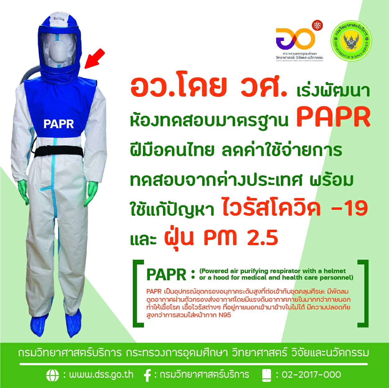 ดร.กรธรรม สถิรกุล หัวหน้ากลุ่มนวัตกรรมเครื่องมือวิทยาศาสตร์และระบบอัตโนมัติ กองวัสดุวิศวกรรม กรมวิทยาศาสตร์บริการ (วศ.) กระทรวงการอุดมศึกษา วิทยาศาสตร์ วิจัยและนวัตกรรม (อว.) เปิดเผยว่า  จากสถานการณ์การแพร่ระบาดของเชื้อไวรัสโคโรน่า 2019   หรือโควิด 19   ตั้งแต่การระบาดระลอกแรกเมื่อต้นปี 2563   ทำให้อุปกรณ์ PAPR  ที่ใช้ในโรงพยาบาลไม่เพียงพอต่อความต้องการของบุคลากรทางการแพทย์ที่มีความเสี่ยงในการติดเชื้อ  จึงมีหน่วยงานทั้งภาครัฐและเอกชนจำนวนหนึ่งได้พัฒนา PAPR   ขึ้นเองในประเทศ  เพื่อให้บุคลากรทางการแพทย์และสาธารณสุขที่ตรวจและดูแลรักษาผู้ป่วยจากการระบาดของ Covid-19 ได้ใช้ในการป้องกันตนเองจากการติดเชื้อ