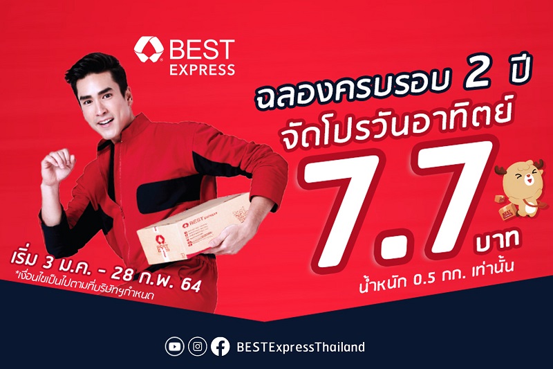 BEST Express (เบสท์ เอ็กซ์เพรส) ผู้ให้บริการ รับ-ส่ง พัสดุด่วนทั่วไทย ไปไหน ไปกัน Everywhere, with you ฉลองครบรอบ 2 ปี จัดโปรพิเศษครั้งใหญ่ เอาใจลูกค้าทั่วประเทศ ด้วยโปรโมชั่นพิเศษส่งพัสดุ 0.5 กิโลกรัม ในราคา 7.7 บาท เฉพาะส่งพัสดุวันอาทิตย์เท่านั้น โปรโมชั่นเริ่มแล้วตั้งแต่วันนี้ – 28 ก.พ. 64 ทุกสาขาทั่วประเทศ โปรเด็ด เผ็ดร้อนแรงไม่หยุด จนต้องร้องซี๊ดดดดดดขนาดนี้ ต้องมาลองใช้บริการกันหน่อยแล้ว เรียกเลย เรียกง่าย เรียกเข้ารับพัสดุถึงที่ มีบริการเข้ารับพัสดุ ฟรี ถึงหน้าบ้าน ไม่จำกัดจำนวนชิ้น เรียกง่ายผ่าน