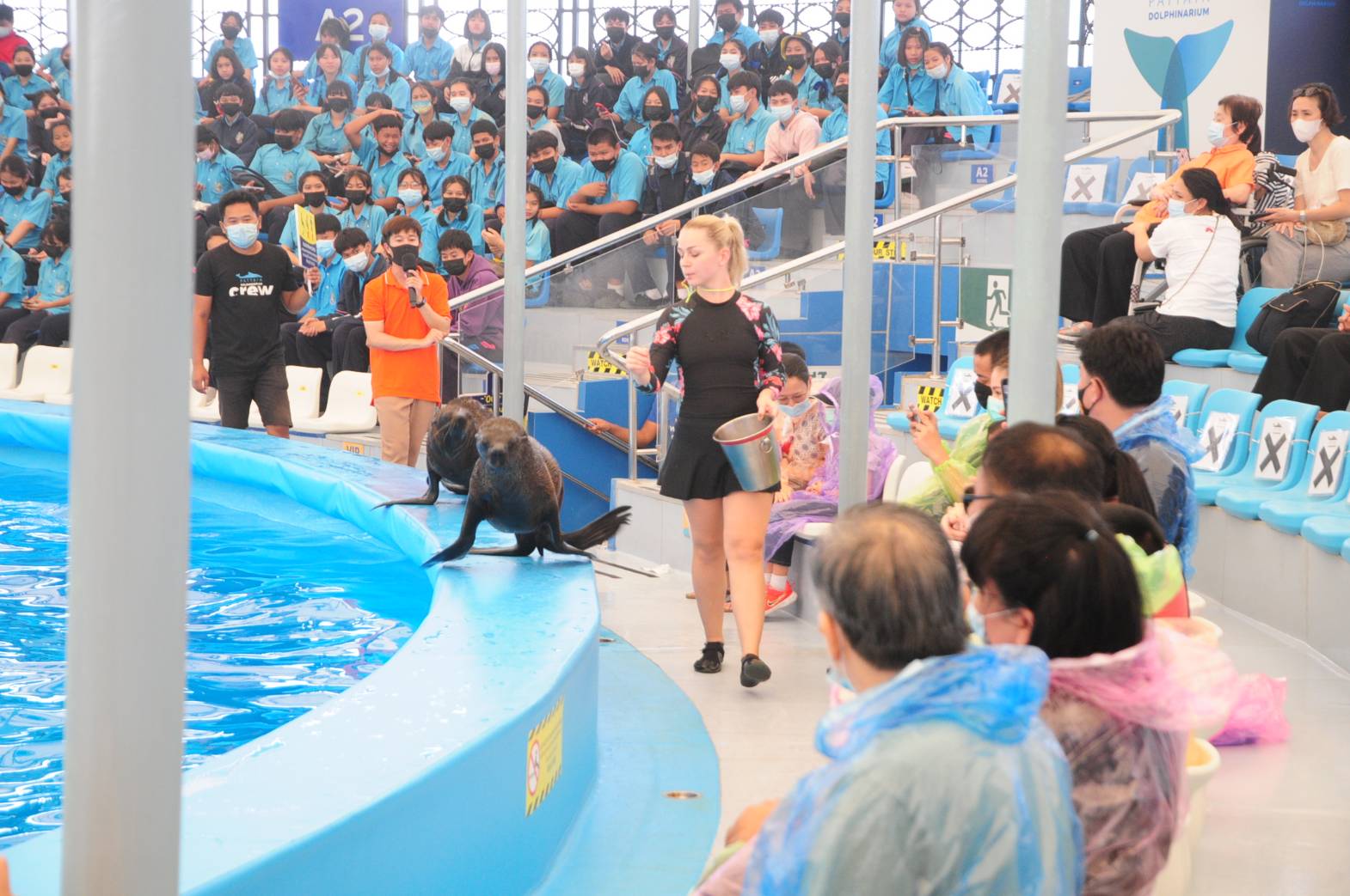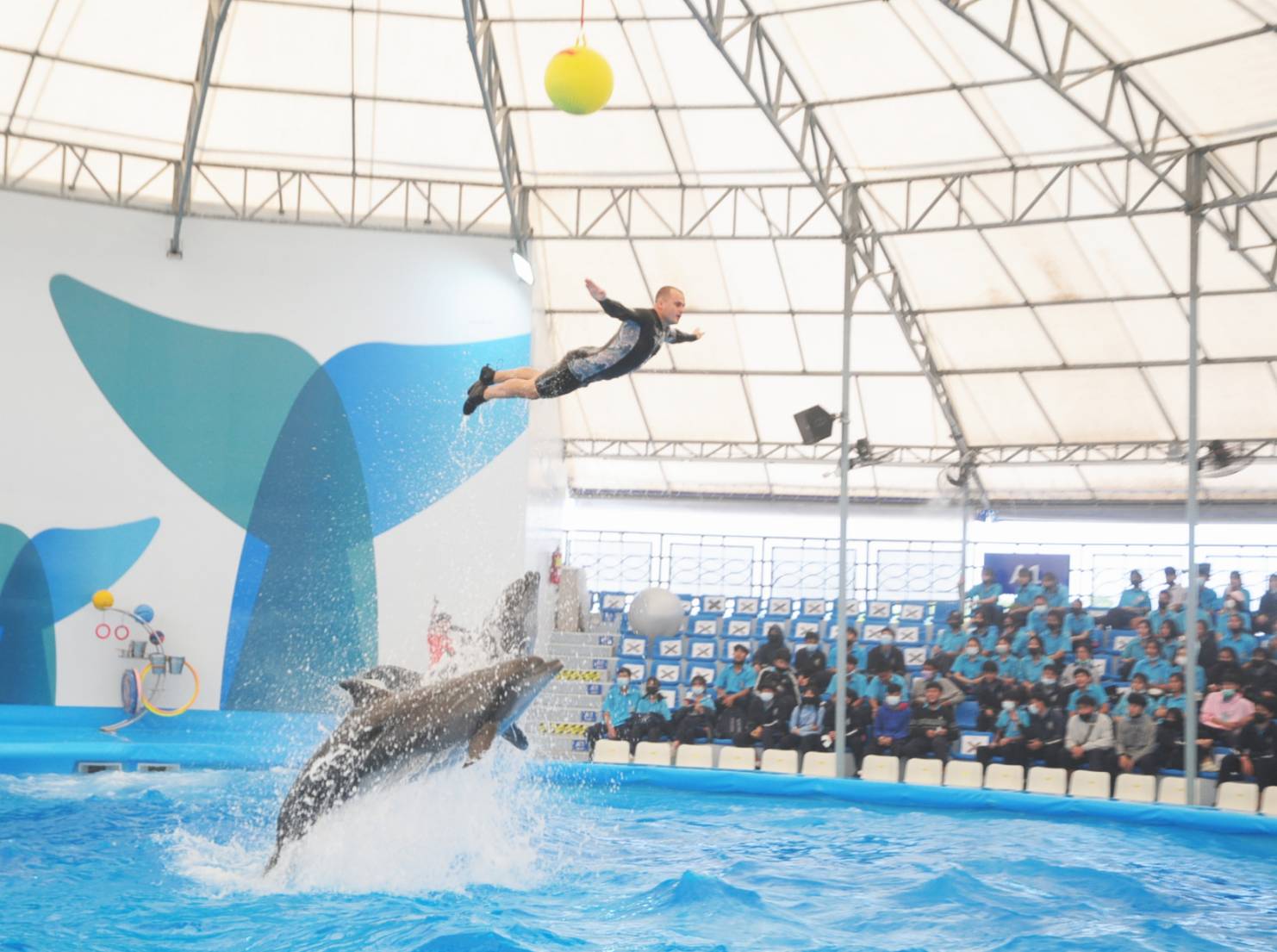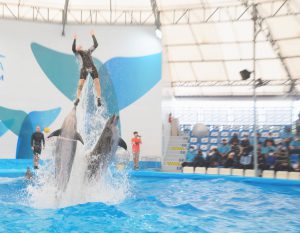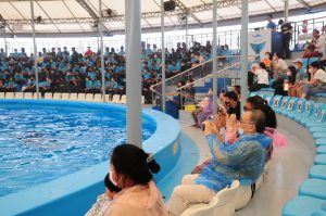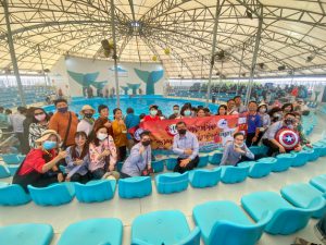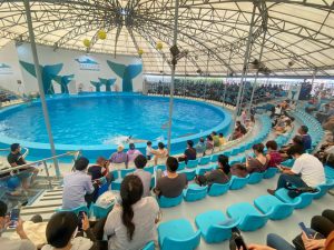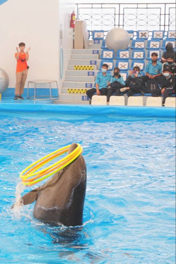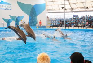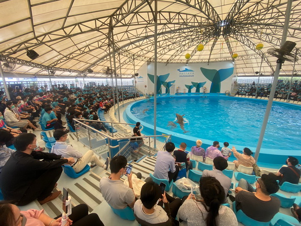 คณะเข้าชมการแสดงของปลาโลมาที่ พัทยาดอลฟินาเรี่ยม ซึ่งถือเป็นสถานที่ท่องเที่ยวยอดฮิตของเมืองพัทยา เพราะมีการแสดงปลาโลมาแสนรู้ที่ไม่เหมือนใคร สร้างความสนุกสนาน ตื่นเต้นเร้าใจแก่ผู้ชม