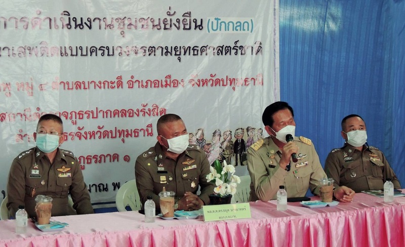 เมื่อ วันที่ 21 มิ.ย. 64 เวลา 13.00 น., : พล.ต.ต.ชยุต มารยาทตร์ ผบก.ภ.จว.ปทุมธานี, พ.ต.อ.ธรรมนูญ เชาวะวนิชย์, พ.ต.อ.นิรุธ ประสิทธิเมตต์ รอง ผบก.ฯ, เดินทางมาตรวจเยี่ยม “โครงการดำเนินงานชุมชนยั่งยืน เพื่อแก้ไขปัญหายาเสพติดแบบครบวงจรตามยุทธศาสตร์ชาติ (ปักกลด)” ของ สภ.ปากคลองรังสิต ณ ชุมชนเฟื่องฟ้า ม.บางลำพู ม.4 ต.บางกะดี อ.เมือง จว.ปทุมธานี, โดยมี พ.ต.อ.จตุพร คงเมือง ผกก.สภ.ปากคลองรังสิต, นายธวัชชัย อึ้งอัมพรวิไล นายกเทศมนตรีเทศบาลเมืองบางกะดี, นางบัณฑิตาภรณ์ ศรีคำภา ผอ.รร.ชุมชนวัดบางกะดี, นายอภิชัย สายช่วย กำนัน ต.บางกะดี, นางนภาพร อยู่เย็น ผู้ใหญ่บ้าน ม.4, น.ส.กัญญารัตน์ บุญให้ พยาบาลวิชาชีพชำนาญการ รพ.สต.บางกะดี, นางณัฏฤตา บุญรอด ประธานอสม.ต.บางกะดี, ตลอดจนผู้เข้ารับการบำบัดยาเสพติด จนท.ชุดชุมชนยั่งยืนฯ, และประชาชนให้เข้าร่วมโครงการอย่างพร้อมเพรียงกัน