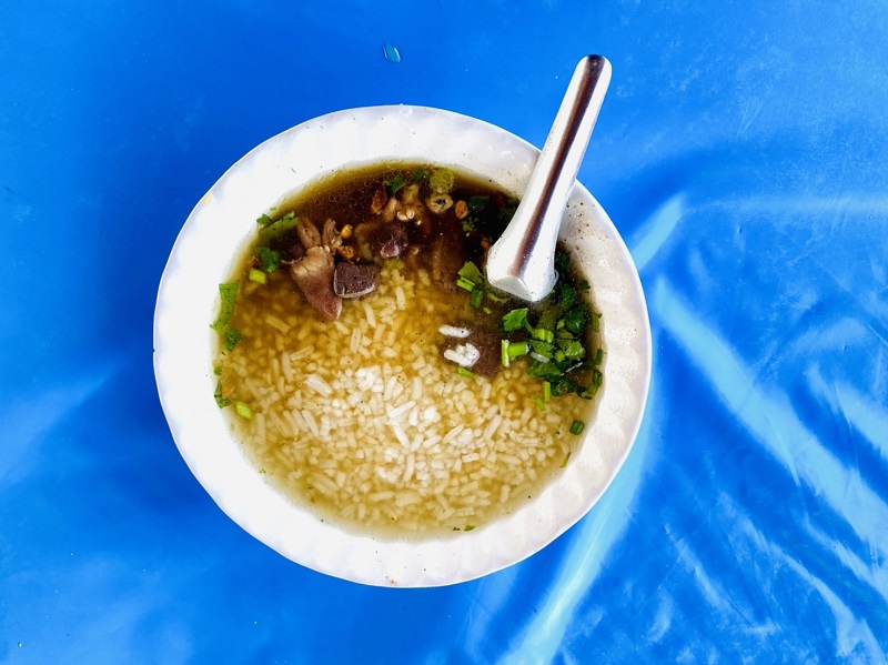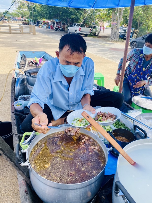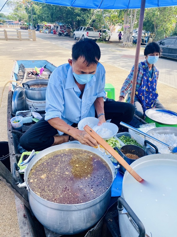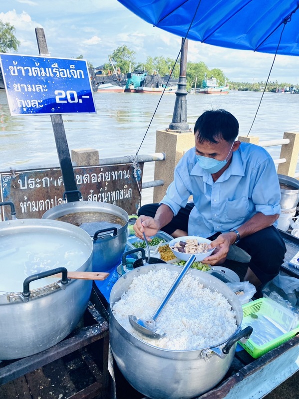 ขอบอกลูกค้าขาประจำและขาจรมากจริง ๆ หนุ่ม’ สุทน ยืนต่อคิวคนที่ 10 แต่ตาเจ็กบริการข้าวต้มอย่างรวดเร็วทันใจ ขอแนะนำถ้าไป 2 คนควรจะสั่งข้าวต้มเป็ดพะโล้ 2 ชาม ข้าวต้มแห้ง 1 ชามแบ่งกินคนละครึ่งชาม ฮ่า ๆ อิ่มกำลังดี ชามละ 20 บาท 3ชาม 60 บาท ตาเจ็กตอนนี้อายุเกิน 60 ปี ข้าวต้มเรือตาเจ็ก ริมเขื่อนวัดช่องลม เส้นทางสายแม่กลองไปตลาดอัมพวาจังหวัดสมุทรสงคราม