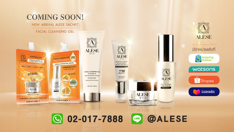 คุณสมบัติของ ALESE PREMIUM HORSE OIL&SNAIL WHITE CREAM (อะลิเซ่ พรีเมี่ยม ฮอร์ซออยล์ แอนด์ สเนลไวท์ ครีม ) อะลิเซ่ครีมเกาหลีที่ประกอบไปด้วยสารสกัดจากธรรมชาติมากกว่า 22 ชนิดทั่วโลก ครีมบำรุงผิวหน้าแบบ All in One ที่เป็นทั้งแบบ Day Cream ,Night Cream, Eye Cream and Sleeping Mark ช่วยบำรุงผิวให้เนียนนุ่มชุ่มชื่น ริ้วรอยแลดูจางลง ผิวดูกระจ่างใสขึ้นอย่างเป็นธรรมชาติ ใช้ได้กับทุกสภาพผิวของคนไทย, ALESE MIRACLE BOOSTING SERUM (อะลิเซ่ มิราเคิล บูทติ้ง เซรั่ม) อะลิเซเซรั่มเกาหลีเป็น เซรั่มน้ำตบ 2 in 1 ประกอบไปด้วยสารสกัดจากธรรมชาติมากกว่า 16 ชนิดทั่วโลก ช่วยฟื้นฟูผิวแบบเร่งด่วน ลดเลื่อนริ้วรอย ไร้จุดด่างดำ กระชับรูขุมขน บางเบาซึมไวไม่มัน และ ALESE MATTE&LIGHT SUNSCREEN PROTECTION CREAM SPF50+ PA++++ (อะลิเซ่ แมทแอนด์ไลท์ ซันสกีน โพรเทคชั่น ครีม) ครีมกันแดด เนื้อบางเบา เกลี่ยง่ายซึมไว ไม่เหนียวเหนอะและไม่ทำให้หน้ามันเหยิ่ม ด้วยคุณสมบัติ 3 in 1 ช่วยปกป้อง บำรุง และลดเลือน ปราศจากริ้วรอยก่อนวัย พร้อมทั้งยังช่วยป้องกัน ผิวหน้าจากรังสี UV รอยแดงจากการโดนแสงแดดนานในระหว่างวัน ป้องกันแสงสีฟ้าจากจอมือถือ และยังมี Soft Focus ช่วยกระจายแสงและเบลอรูขุมขน พร้อมทั้งเปิดตัวผลิตภัณฑ์ใหม่ ALESE FACIAL CLEANSING GEL (อะลิเซ่ เฟเชียล คลีนซิ่ง เจล) อะลิเซ่คลีนซิ่ง เจลทำความสะอาดผิวหน้า สูตรอ่อนโยน ไม่ทำให้ผิวแห้งตึง ลดความมันส่วนเกิน ถนอมผิวได้อย่างดีเยี่ยม ที่จบครบใน 1 เดียว ทั้งทำความสะอาด บำรุง พร้อมปกป้องผิวจากมลภาวะ ด้วยสารสกัดจากธรรมชาติ เหมาะกับทุกสภาพผิว รวมถึงคนผิวบอบบางหรือแพ้ง่ายก็ใช้ได้อีกด้วย