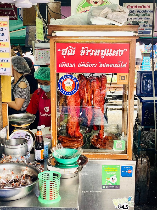 ถัดไปคือ “ร้านสุณีข้าวหมูแดงหมูกรอบ” เจ้าแรกเจ้าเดียวในตลาดพลูขายมาแล้วเกิน 60 ปี ก็มีผู้คนเข้าคิวรอซื้อกันเต็มหน้าร้านเหมือนกันครับ ร้านนี้ก็จัดการเว้นระยะห่างสำหรับลูกค้าแจ้งจุดให้ยืนรออย่างชัดเจนครับ