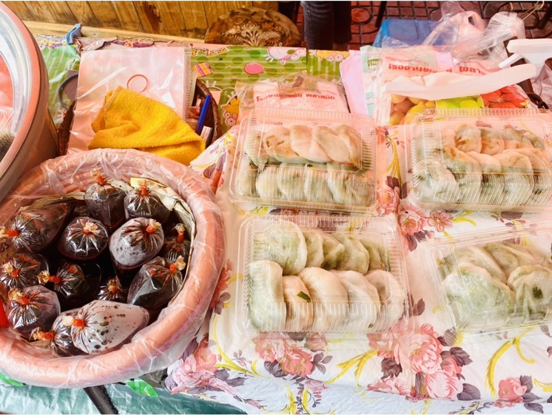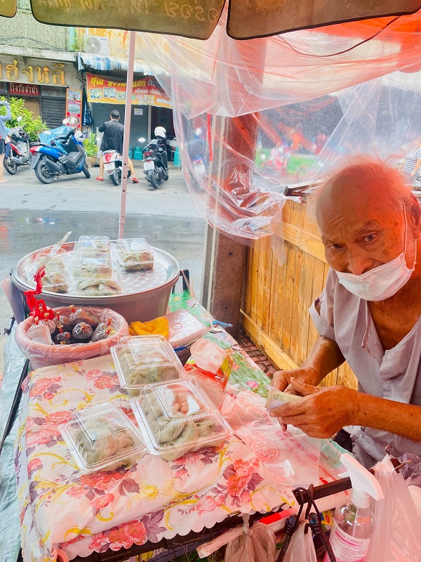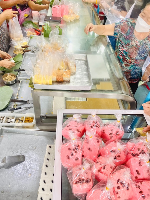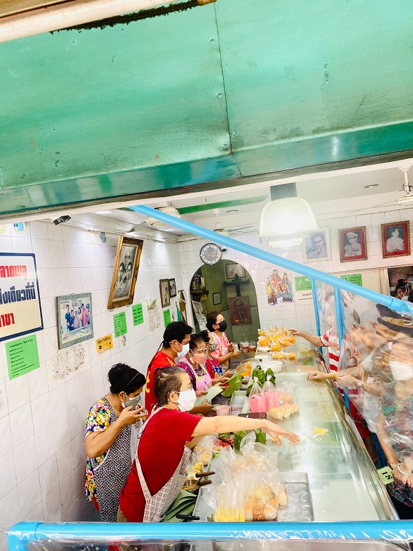 อีกร้านที่ห้ามพลาดเมื่อมาถึงตลาดพลูครับ “ขนมหวานตลาดพลู” มองไปเห็นผู้คนต่อคิวซื้อขนมหวานกันมากจริงๆ ผมเดินไปดูมีขนมให้เลือกหลากหลายชนิดมากครับ เช่น ขนมสาลี่ ขนมหม้อแกงและข้าวเหนียวสังขยา และอื่นๆ อีกมากครับ ทางร้านมีมาตรการสำหรับการป้องกันเชื้อโควิด 19 คือใส่หน้ากากทั้งผู้ซื้อและผู้ขาย เว้นระยะห่าง พร้อมกันมีแนวกันสำหรับผู้ซื้อและผู้ขายครับ