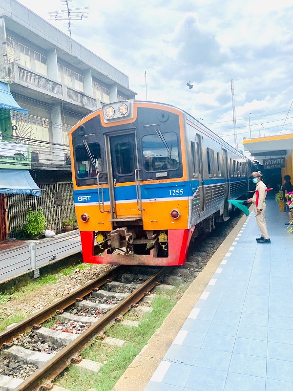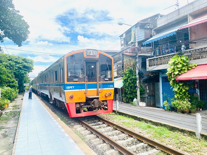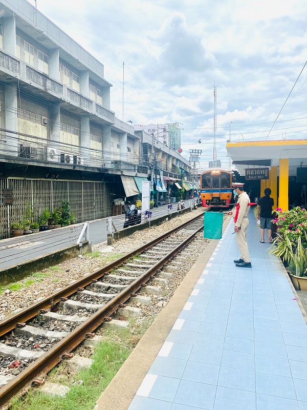 ในย่านตลาดพลูผมเองเดินมาถึงริมทางรถไฟเรียก “แยกตลาดพลู” เป็นเวลาที่รถไฟกำลังเข้าเทียบชานชลาพอดีเลยครับ ทำให้ได้ภาพสวย ๆ มาฝากผู้อ่านทุกท่านครับ ชุมชนริมทางรถไฟตลาดพลู ดูเงียบสงบ สะอาด สบายตาน่ามองและเหมาะสำหรับการเดินเล่นชิลล์ๆ พร้อมชิมของอร่อยในย่านตลาดพลูกันครับ