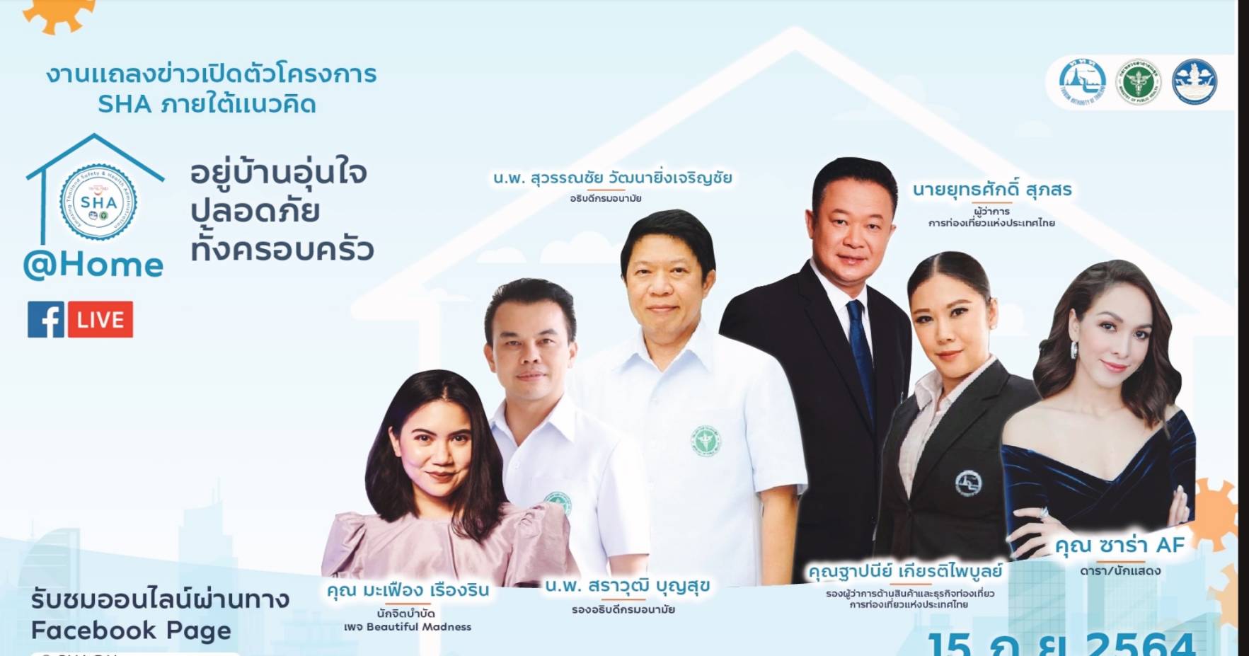 วันนี้ (15 กันยายน 2564) นายยุทธศักดิ์ สุภสร ผู้ว่าการการท่องเที่ยวแห่งประเทศไทย (ททท.) นพ.สุวรรณชัย วัฒนายิ่งเจริญชัย อธิบดีกรมอนามัย กระทรวงสาธารณสุข พร้อมด้วยคณะผู้บริหาร ททท. และกระทรวงสาธารณสุข ร่วมแถลงข่าวการดำเนินงานโครงการ SHA ภายใต้แนวคิด SHA@Home อยู่บ้านอุ่นใจ ปลอดภัยทั้งครอบครัว เพื่อเป็นแนวทางปฏิบัติในบ้านและที่พักอาศัยสำหรับภาคประชาชนทั่วไปและร่วมเป็นส่วนหนึ่งให้สถานการณ์การระบาดเชื้อโควิด-19 ในประเทศไทยได้คลี่คลาย โดยถ่ายทอดการแถลงข่าวผ่านช่องทาง www.facebook.com/shaathome
