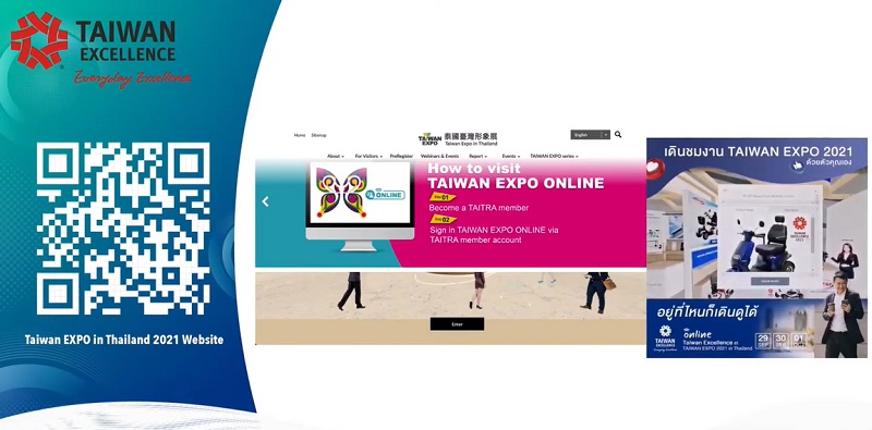 นอกจากงานสัมมนาออนไลน์นี้แล้ว ทั้ง 4 บริษัท ยังจัดแสดงผลิตภัณฑ์ในงาน Taiwan Expo 2021 in Thailand online” ซึ่งจัดขึ้นระหว่างวันที่ 29 กันยายน ถึง 31 ต.ค. 2564 นอกจากนี้ ยังมีผลิตภัณฑ์ที่ได้รับรางวัล Taiwan Excellence Award อีก 39 ผลิตภัณฑ์มาร่วมจัดแสดง มีตั้งแต่ผลิตภัณฑ์ทางการแพทย์และด้านความงาม อุปกรณ์กีฬาและสันทนาการ ผลิตภัณฑ์สำหรับอุตสาหกรรม การขนส่ง ไปจนถึงฮาร์ดแวร์ต่างๆ โดยสามารถเข้าร่วมงานได้ที่เว็บไซต์ https://thai.taiwanexpoasean.com/en/index.html (เว็บไซต์เปิดให้เข้าชมงานตั้งแต่ 22 ก.ย. ถึง 29 ต.ค.)