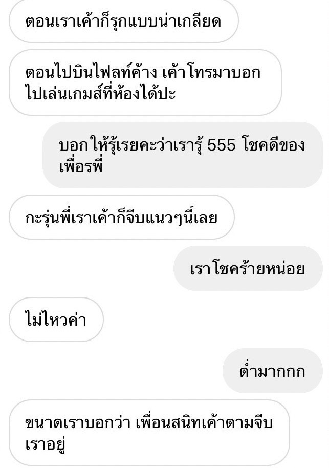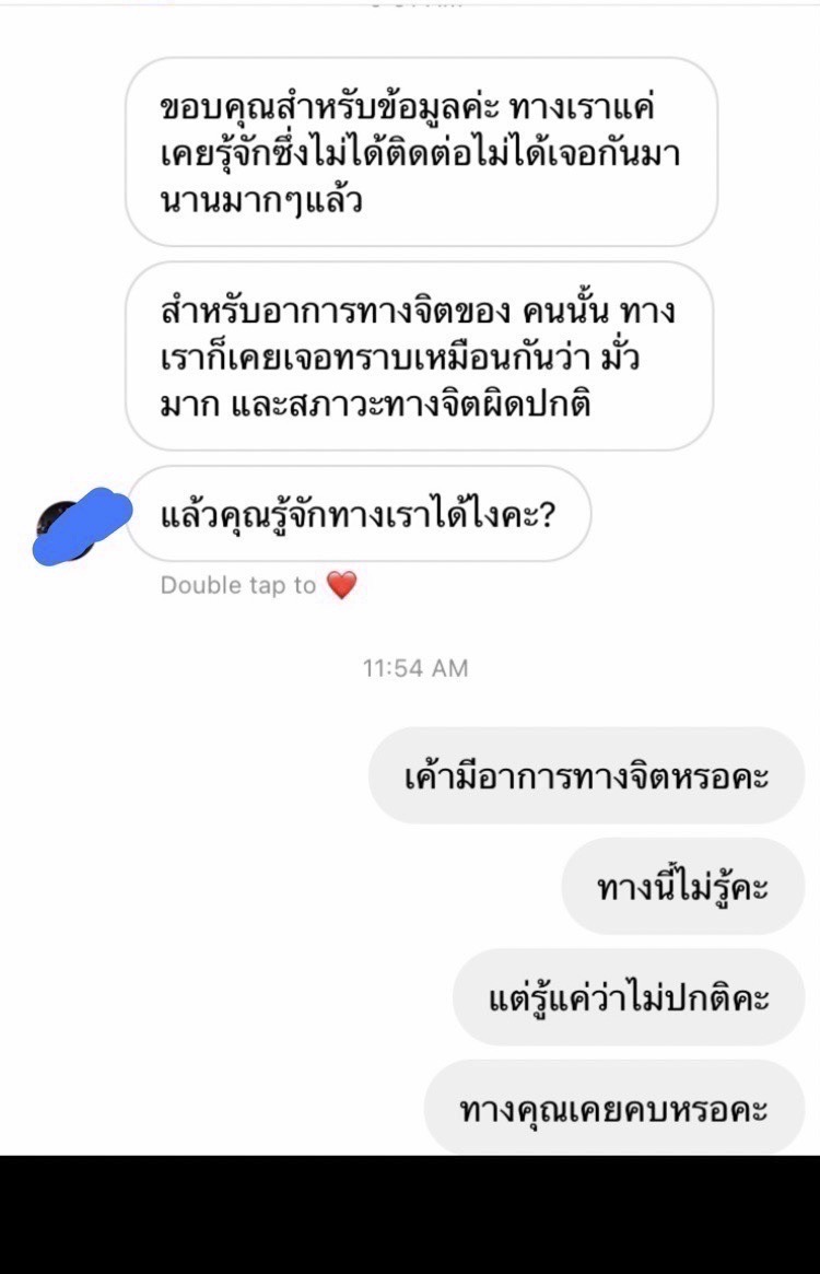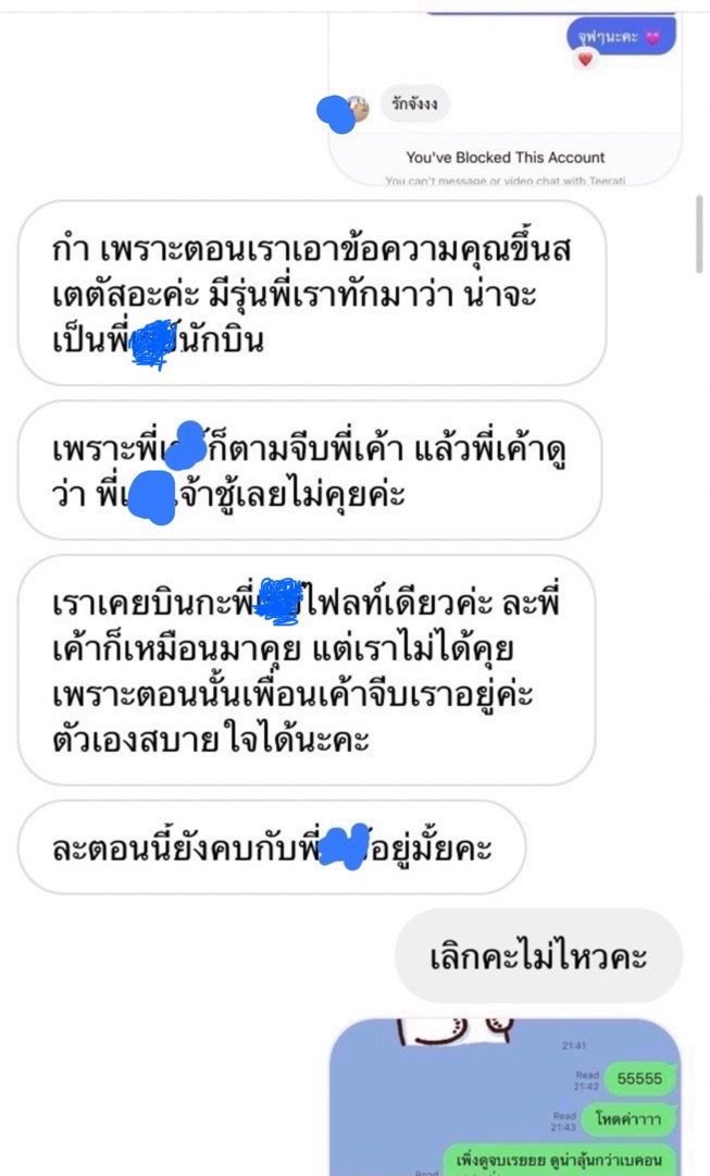 หลังจากที่ได้เลิกรากันไป ไม่ได้ติดต่อหรือรับสายแต่อย่างใด ทางเค้ามีการส่งข้อความมาข่มขู่ ไม่ให้เราไปแจ้งความหรือร้องเรียนหน่วยงานไหน ขู่ว่าจะแจ้งความเอาผิดหากนำเรื่องราวของเค้าไปแฉ